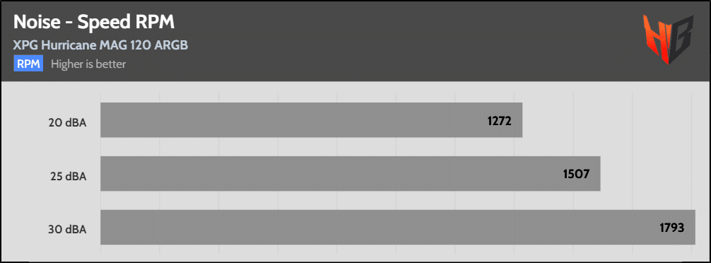 For these tests, I set the fan to speeds with noise output at the following predefined levels: 20/25/30/35/40/45 dBA. I skip the corresponding tests if the fan under the test cannot reach some noise levels. The speeds shown in the graph below are measured with the fan in a clear space inside my hemi-anechoic chamber without any obstacles. I set these speeds on the Longwin machine, but they slightly change due to the variable conditions applied by the device.