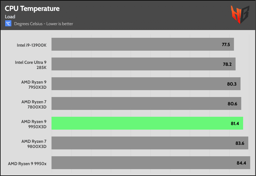 The power consumption difference in blender between the 9950X3D and the 7950X3D is vast, but thanks to the improved contact of the heatspreader with the CPU, the operating temperatures are close.