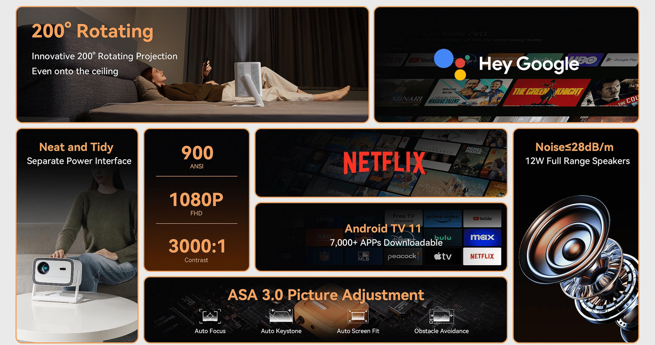 Setting it up is almost suspiciously easy. Auto-focus, auto-keystone correction, obstacle avoidance, and auto screen fitting (thanks to the smart ASA 3.0 tech) mean you’ll have a perfect square image in seconds without lifting a finger.