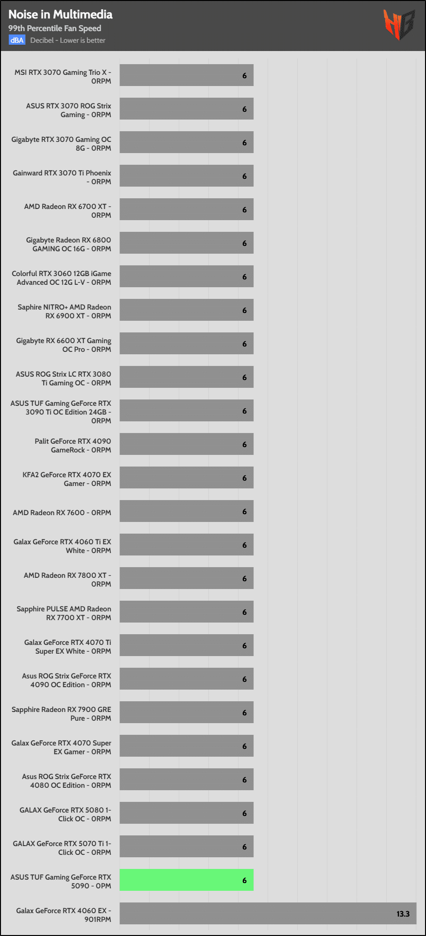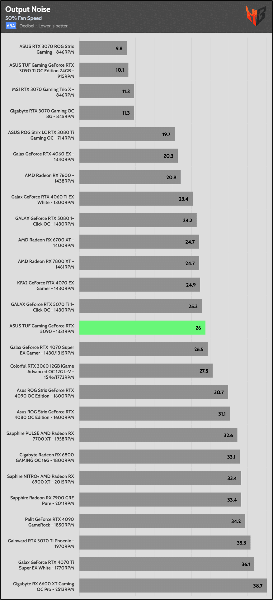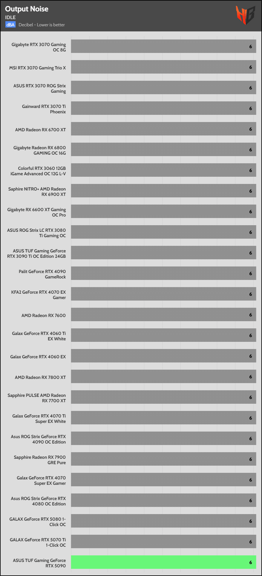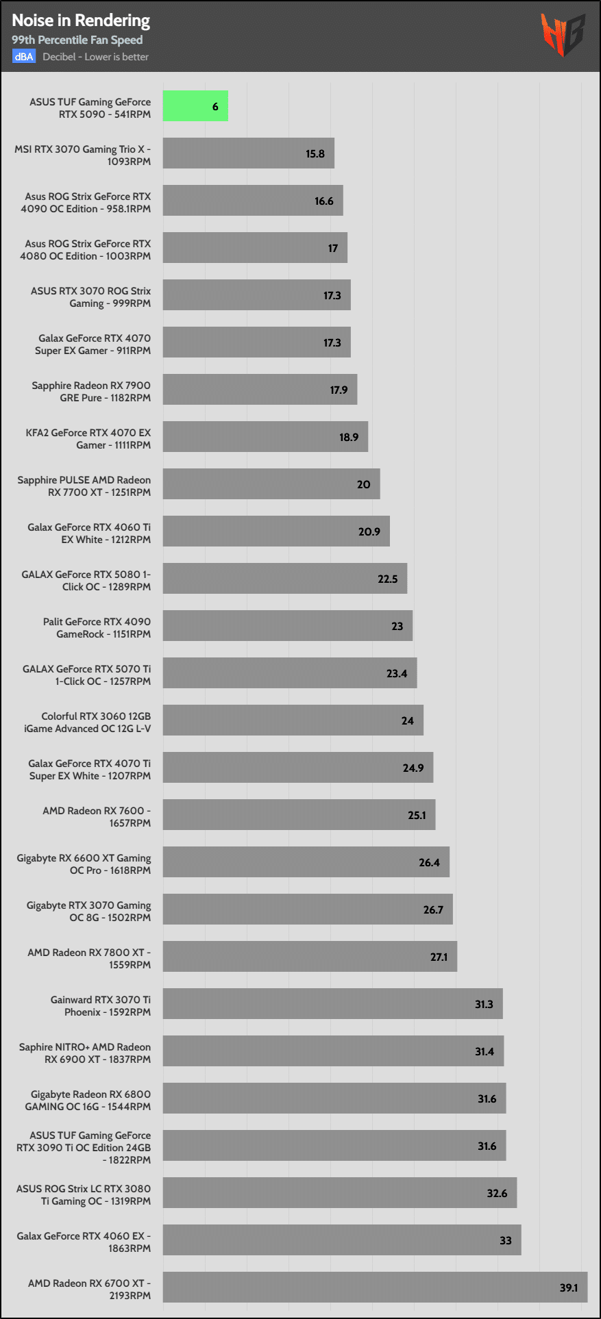 Thanks to the fan-stop feature, most graphics cards are dead quiet at idle and multimedia. The Asus TUF RTX 5090 is also dead silent at rendering.