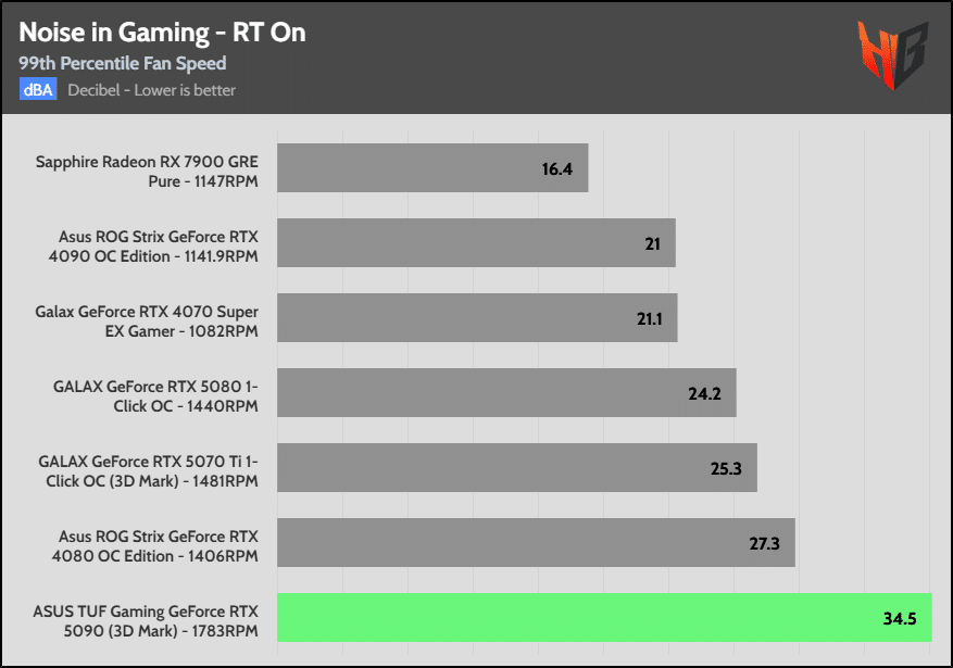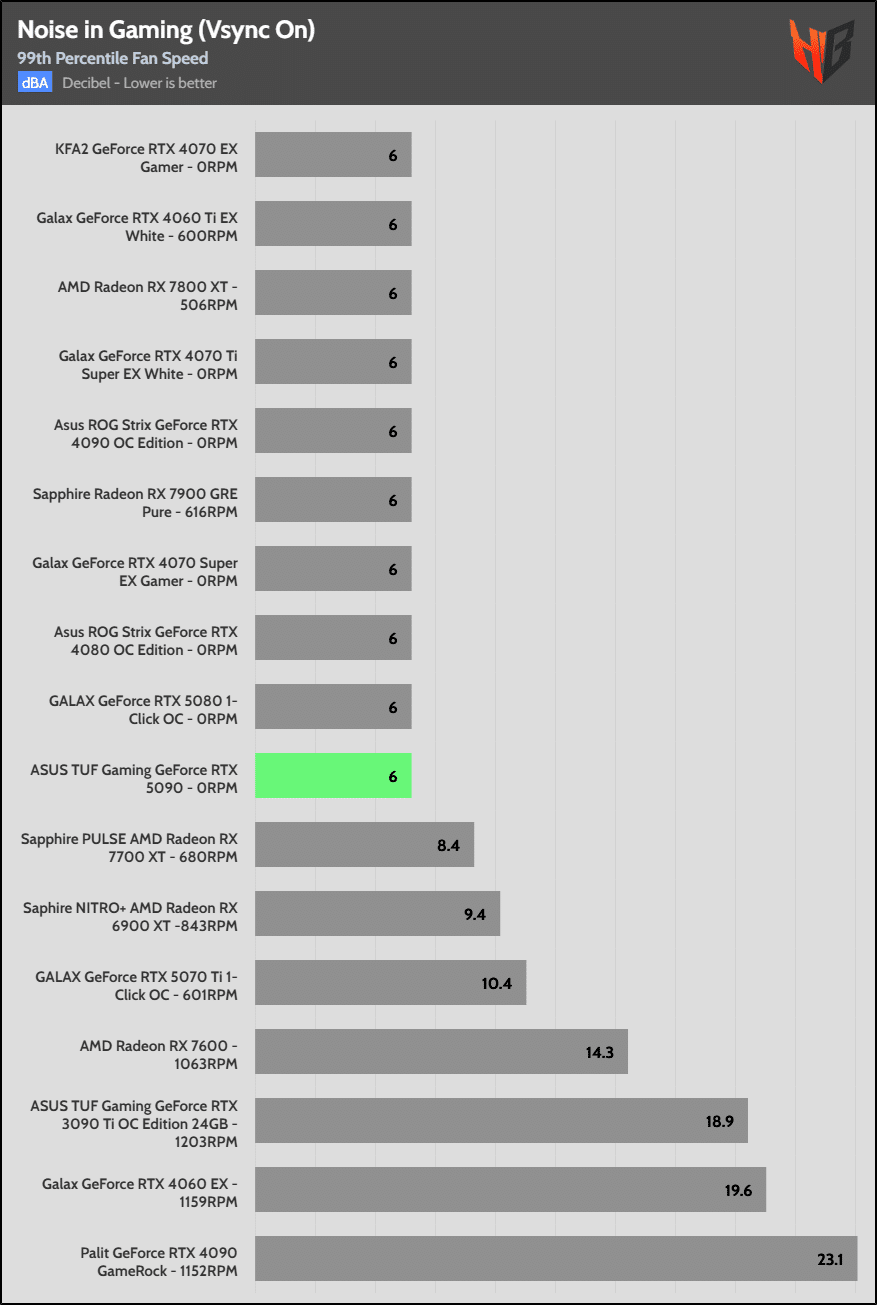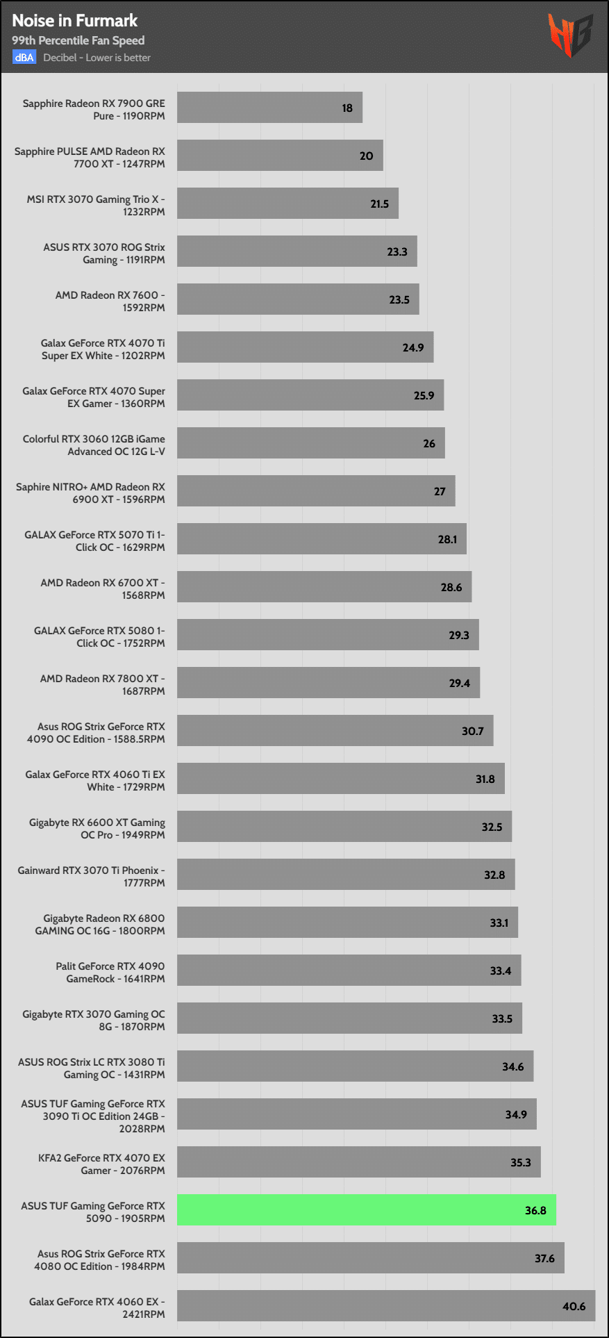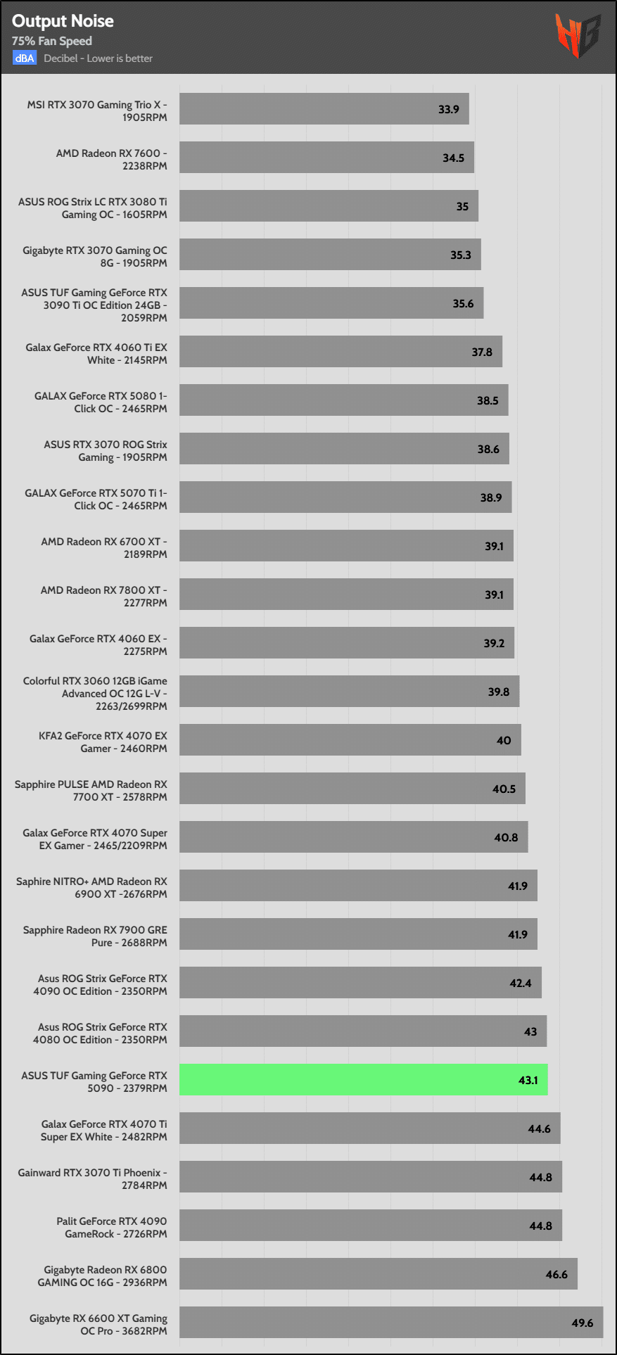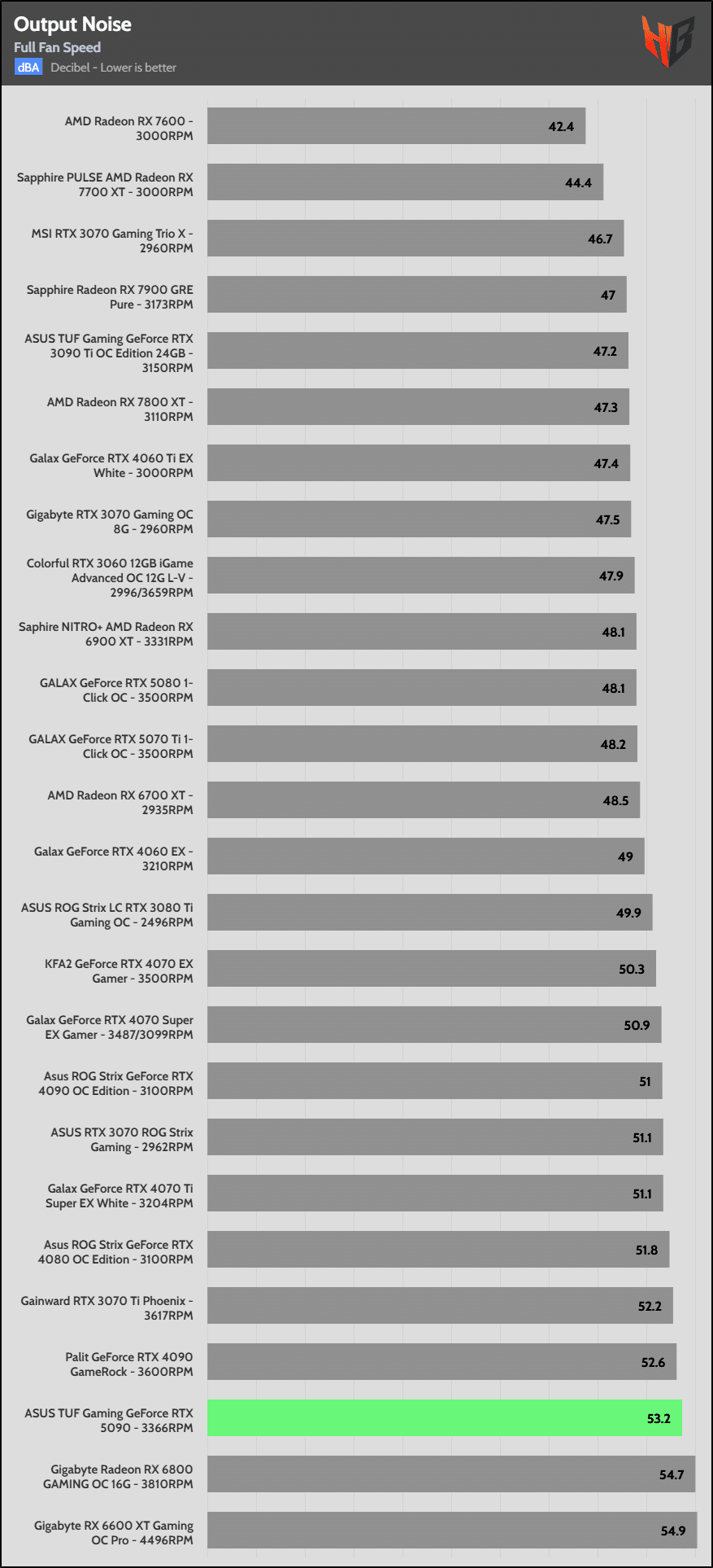 Thanks to the fan-stop feature, most graphics cards are dead quiet at idle and multimedia. The Asus TUF RTX 5090 is also dead silent at rendering.