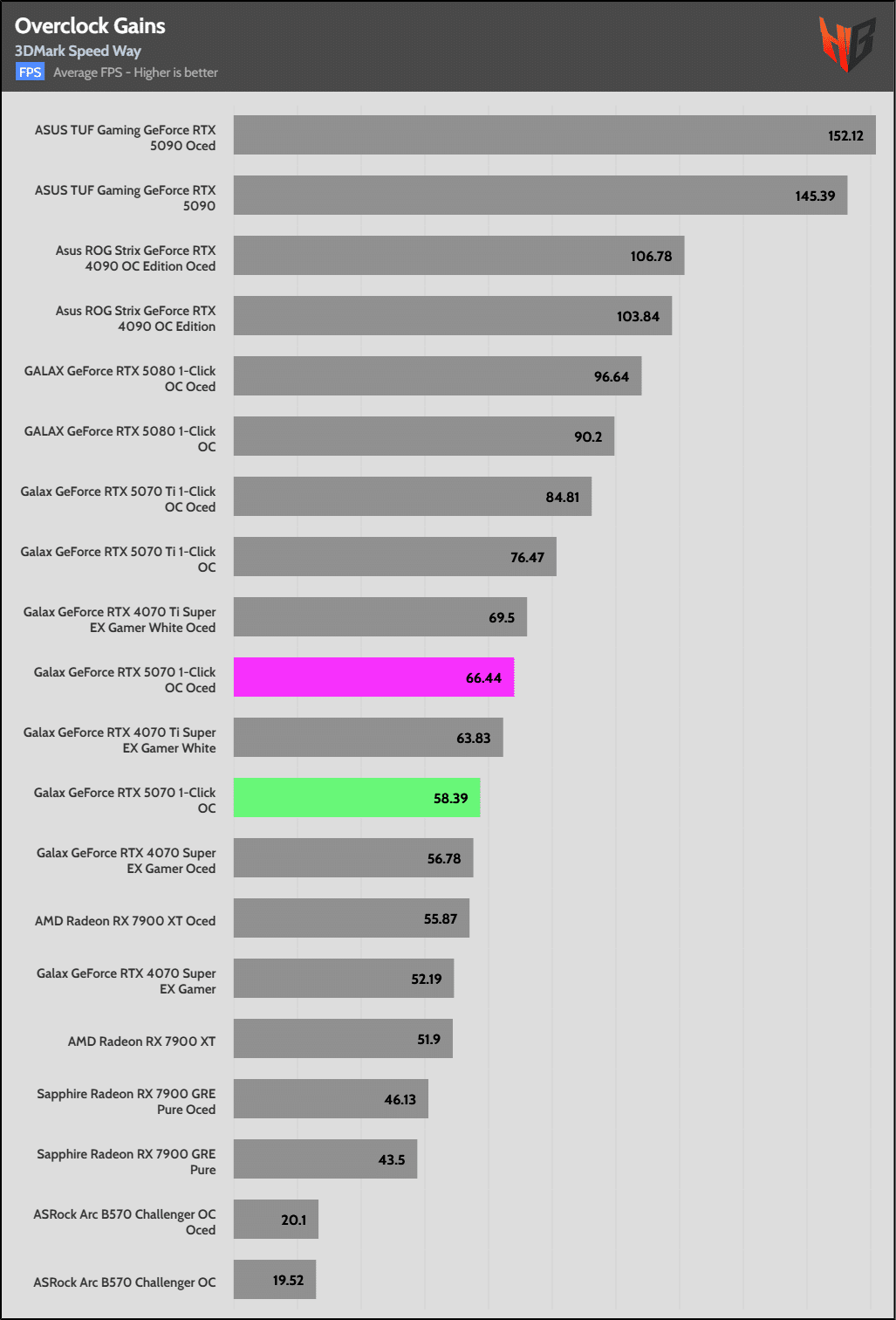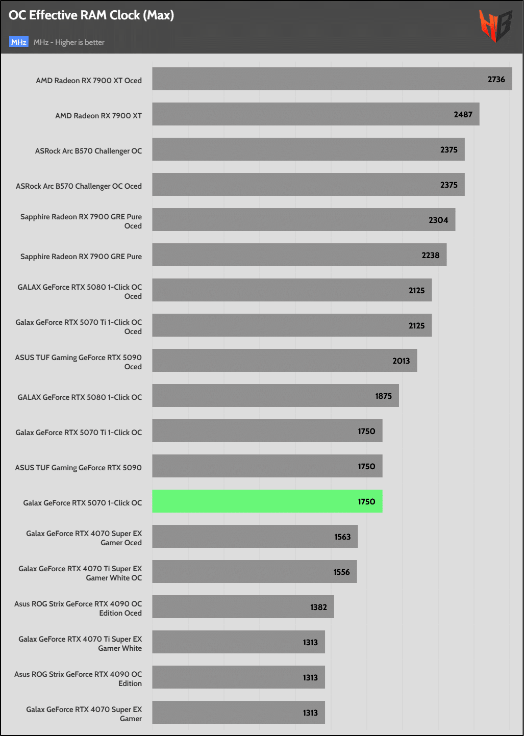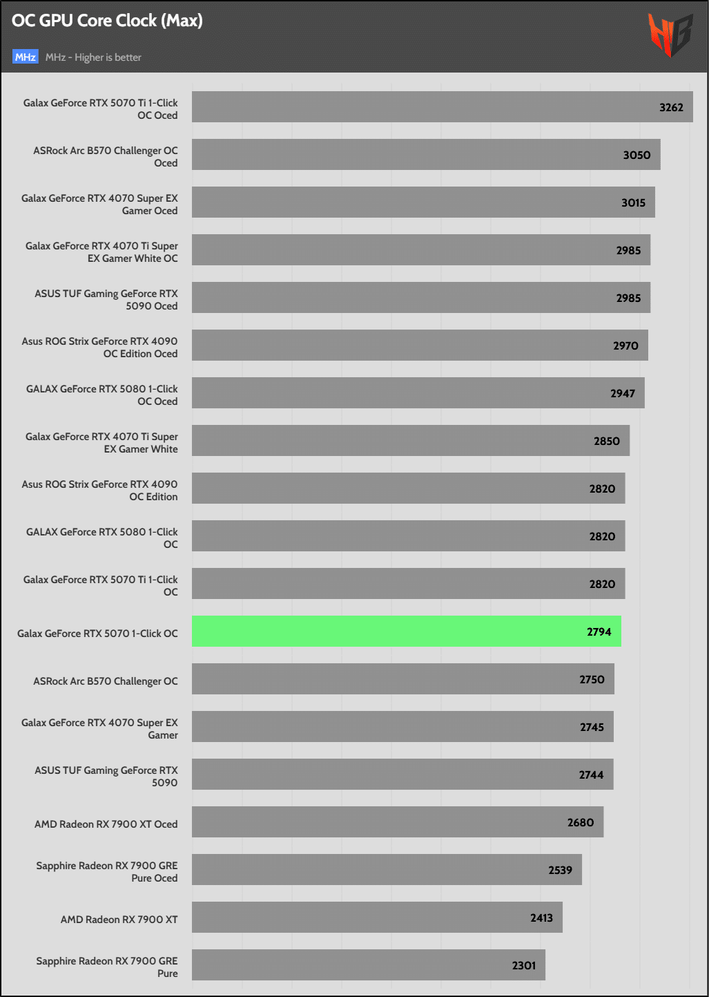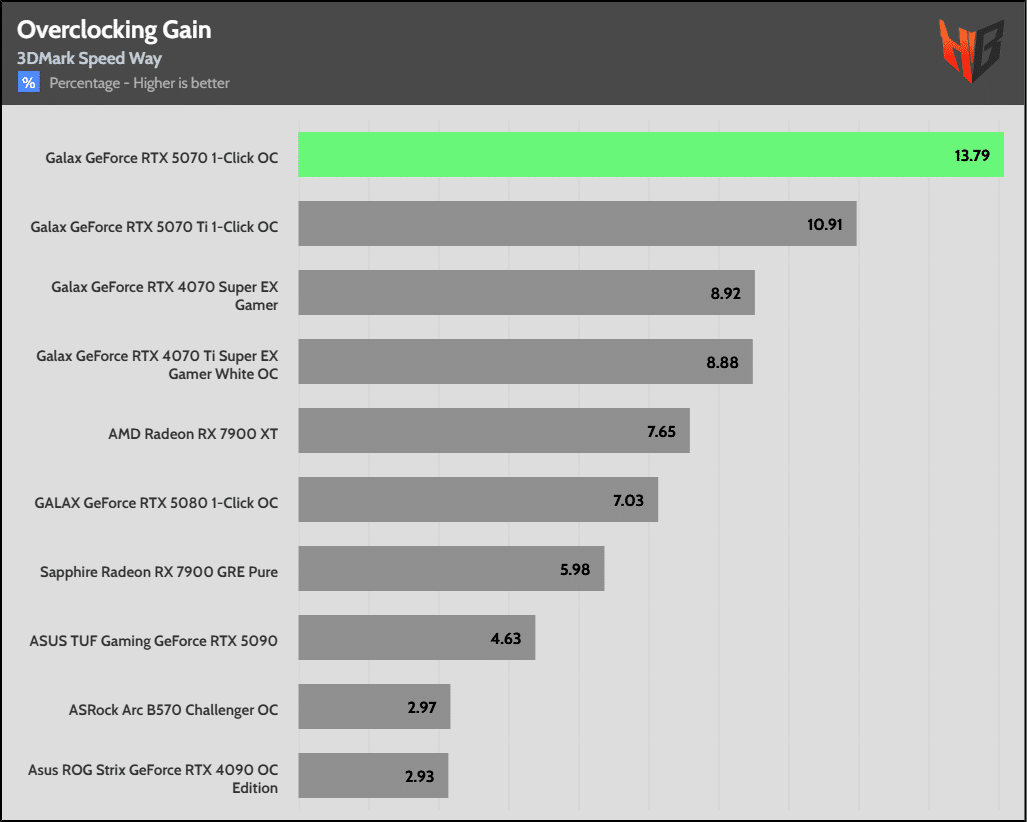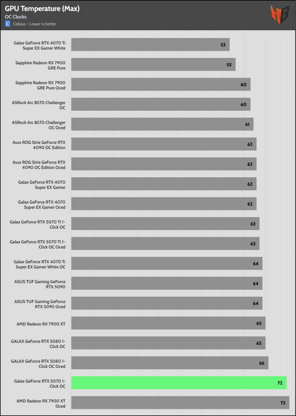 There is no temperature difference between stock and OC speeds because the power consumption difference is low, and the cooling system is competent managing effectively the GPU’s thermal load.
