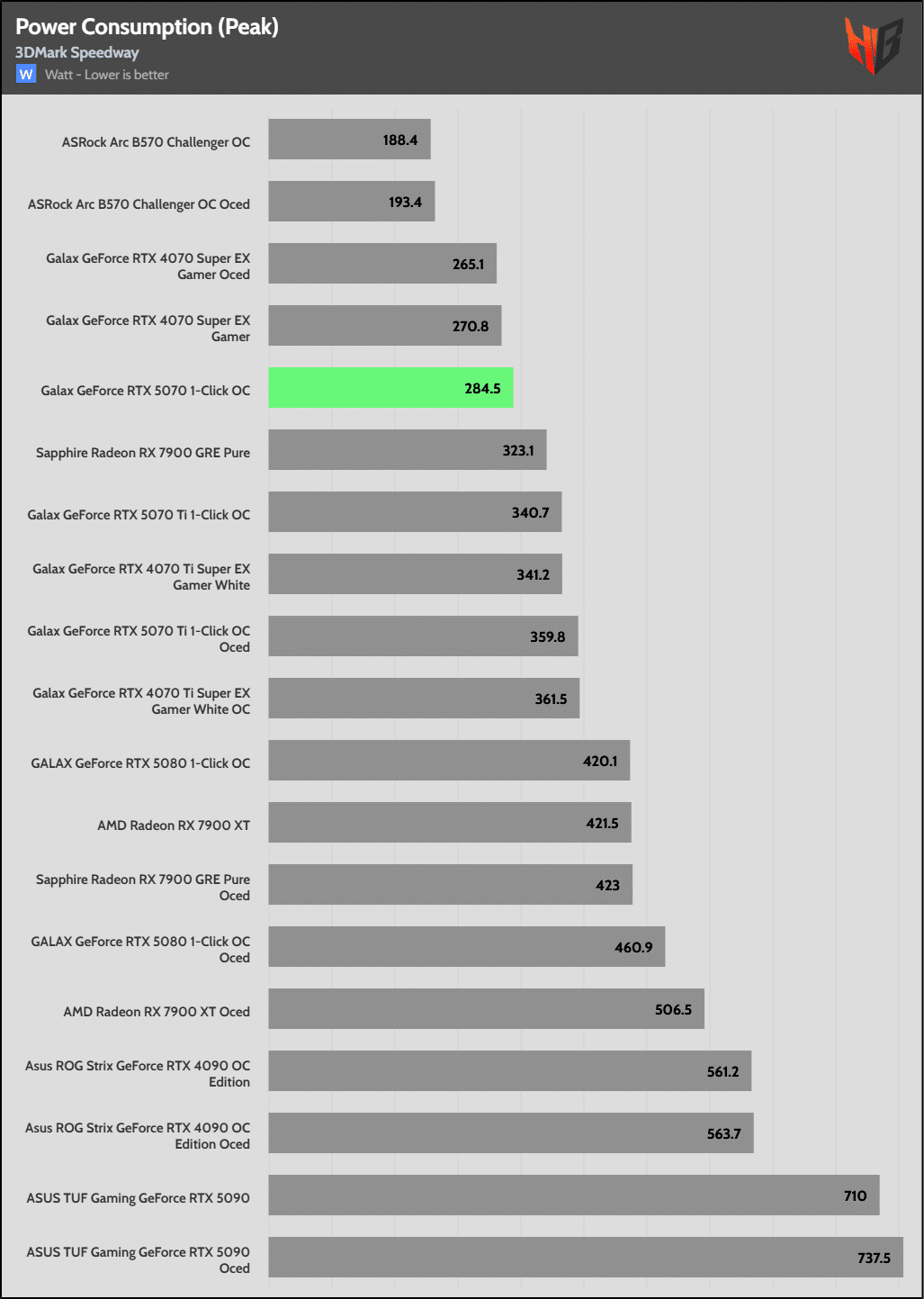 The power consumption difference between standard and overclocked modes is low since the card already operates at the limit of 12V-2×6, but the total power consumption reading is high.