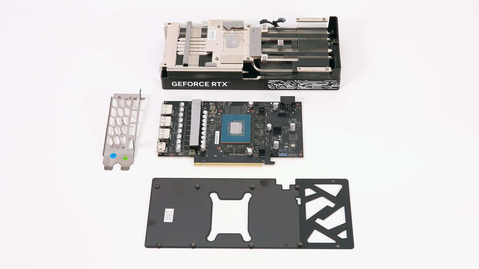 The main parts of the graphics card are the backplate, cooler, PCB, PCIe bracket, and fan assembly.