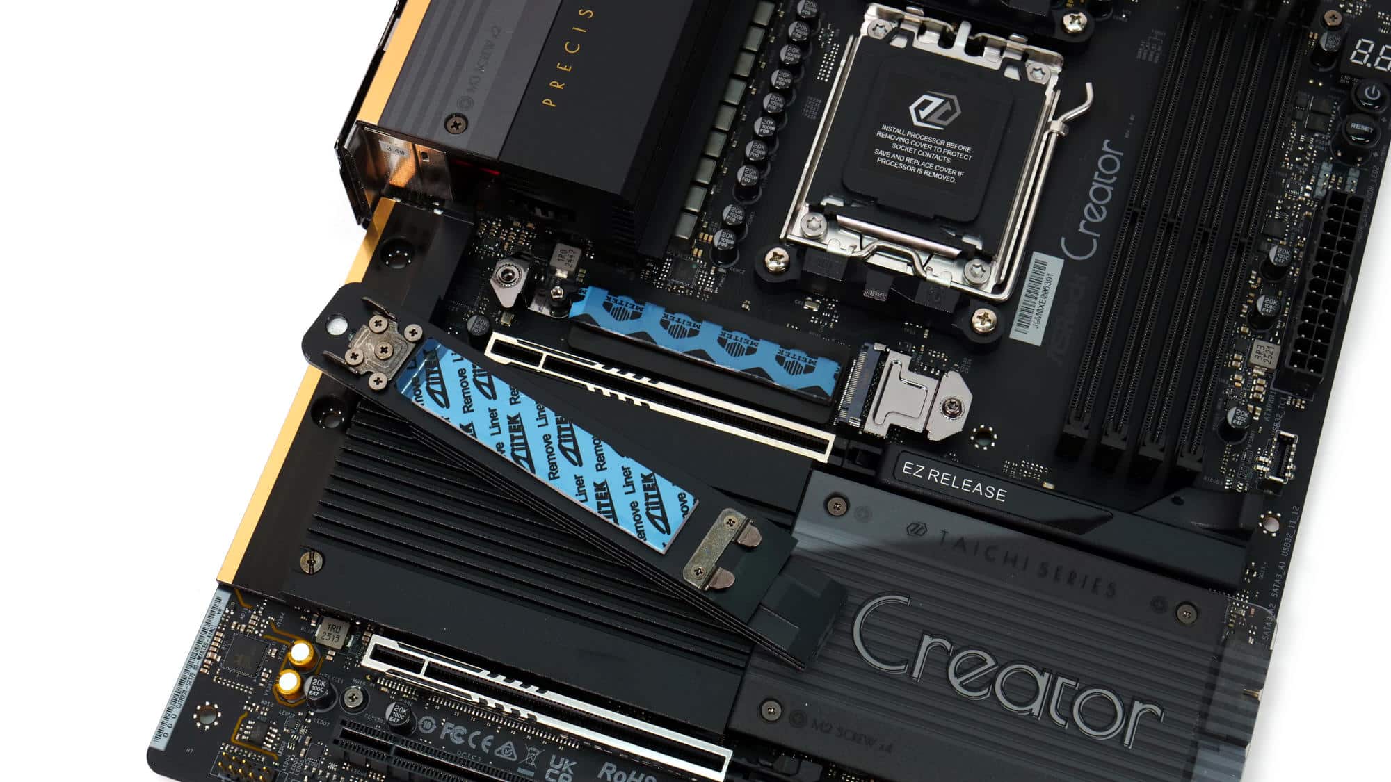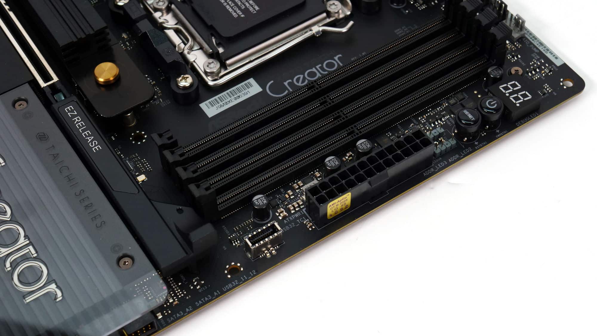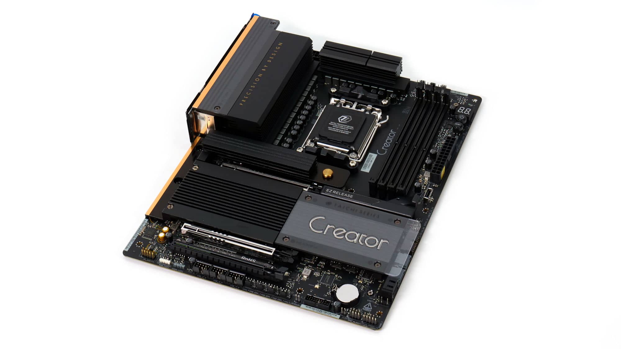 The color scheme of this board is elegant and gives off a premium feel. The design of the VRM coolers is somewhat blocky, but the overall look is very clean. The CMOS battery is a bit of an eyesore, though the acrylic panel with the “Creator” branding stands out nicely, complemented by the M.2 heatsink beside it.