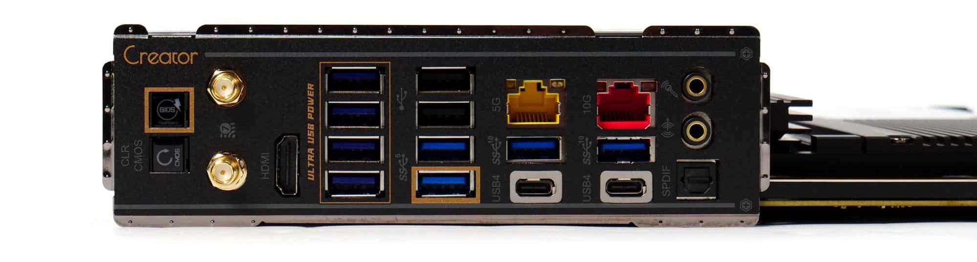 The rear I/O is fully loaded, one of the first boards to include both 10GbE and 5GbE Ethernet ports. Starting from the top, there are two antenna connectors, an HDMI port, six USB 3.2 Gen 1 Type-A ports (5 Gbps, with four supporting USB Ultra Power), two USB 2.0 ports, two USB 3.2 Gen 2 (10 Gbps) ports, two USB4 ports (40 Gbps), the two Ethernet jacks, a line-out, a mic-in, and an SPDIF out port.