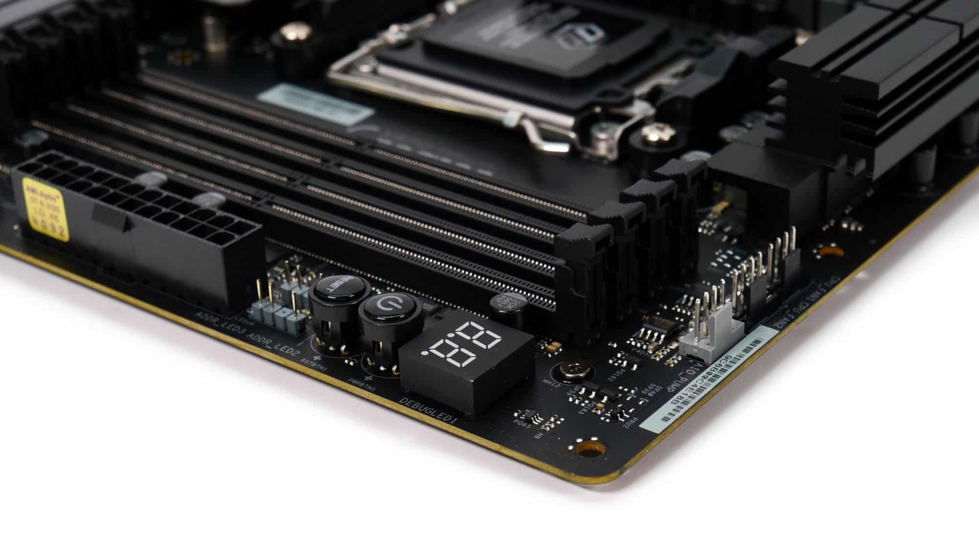 In the top-right corner, there are three PWM connectors, two for CPU fans and one for an AIO pump. You’ll also find the diagnostic screen, onboard power and reset buttons, and two 5V ARGB connectors.