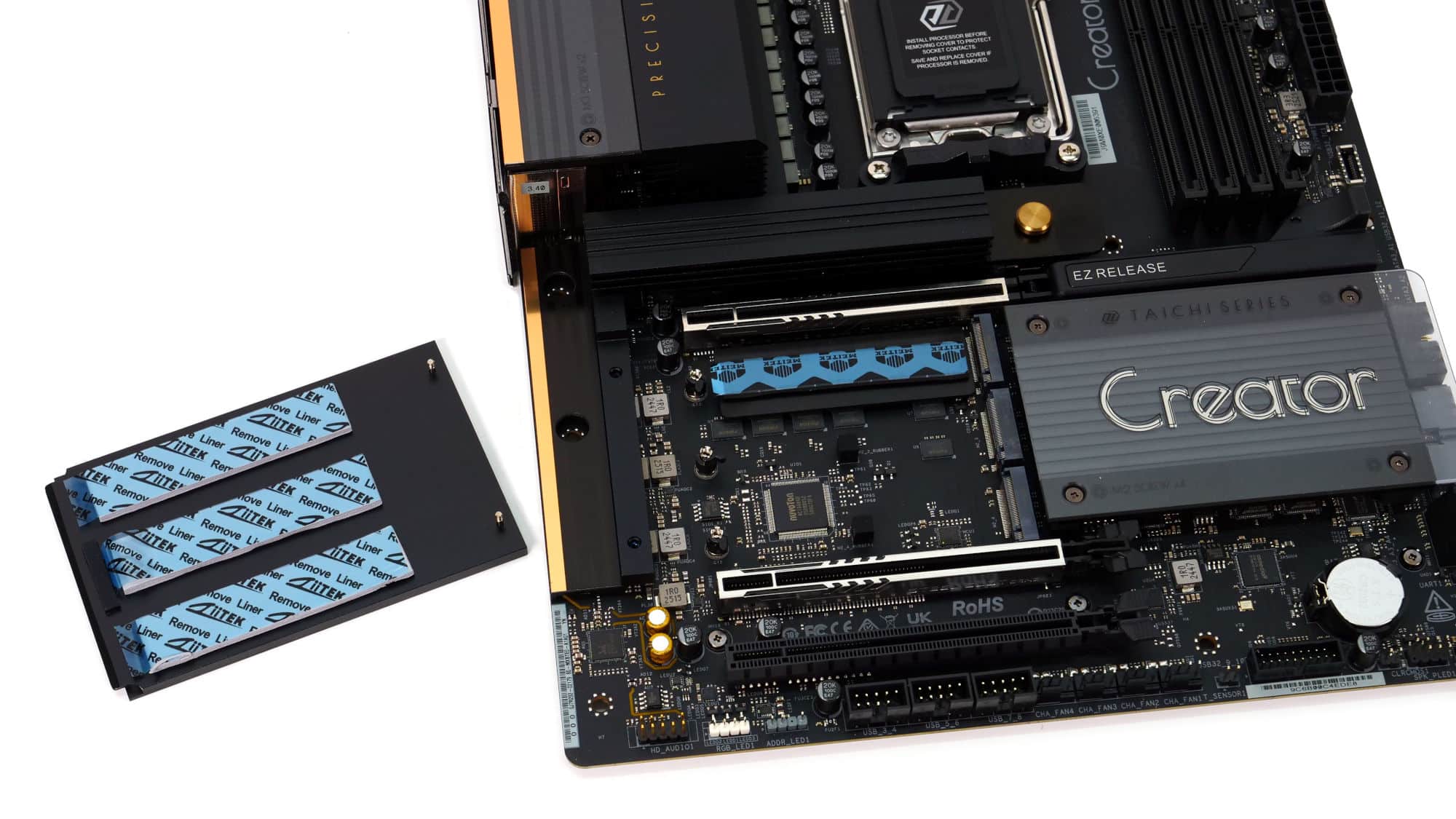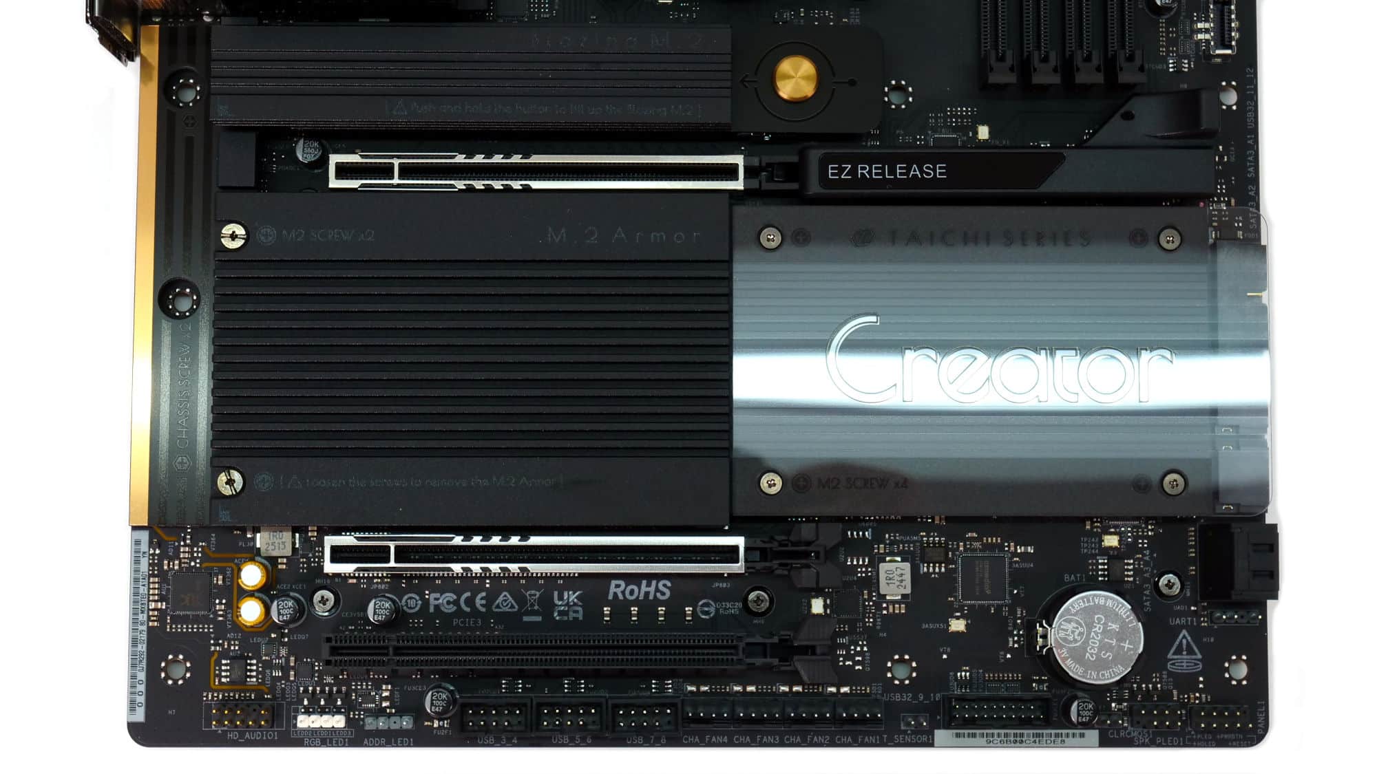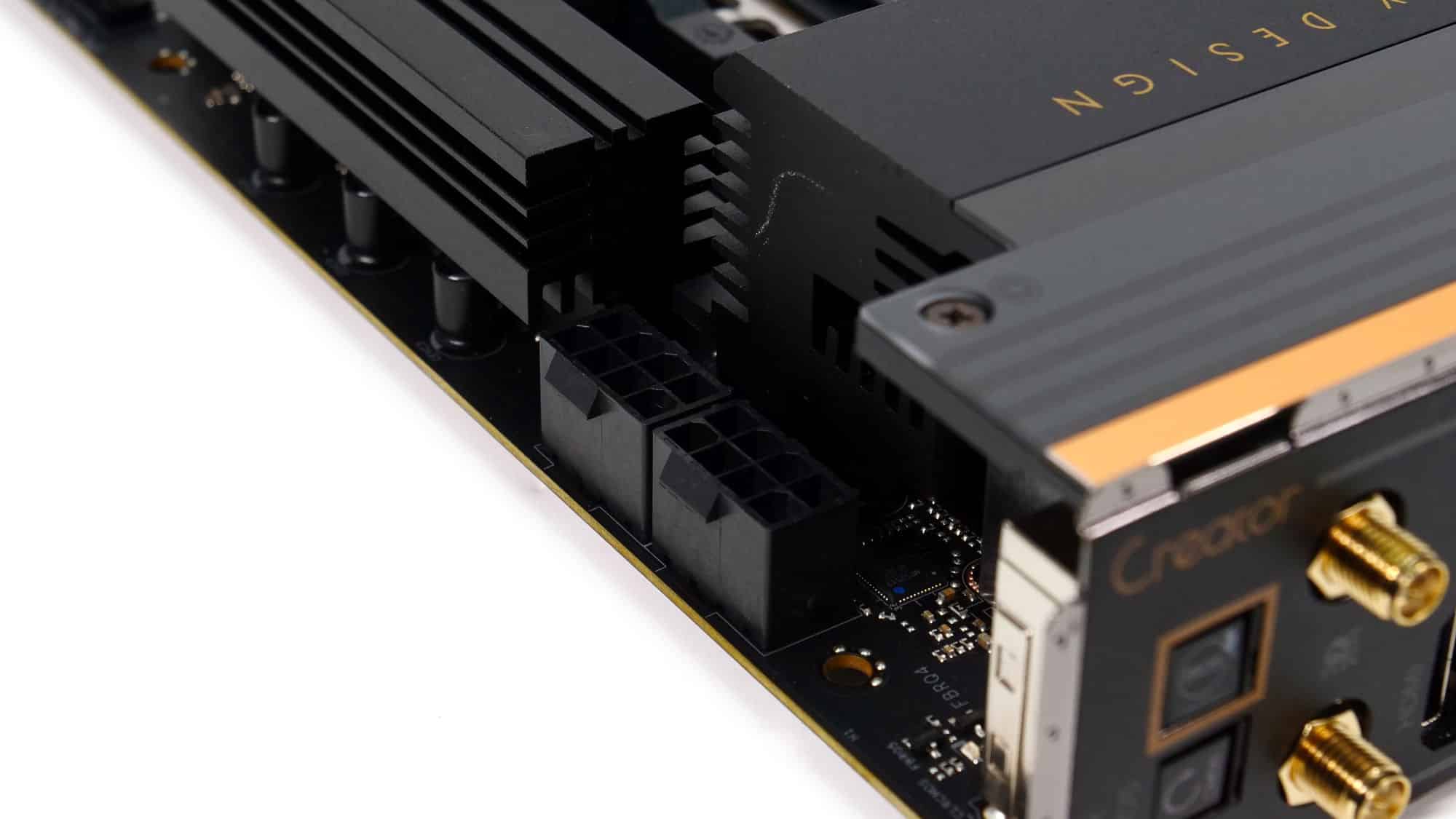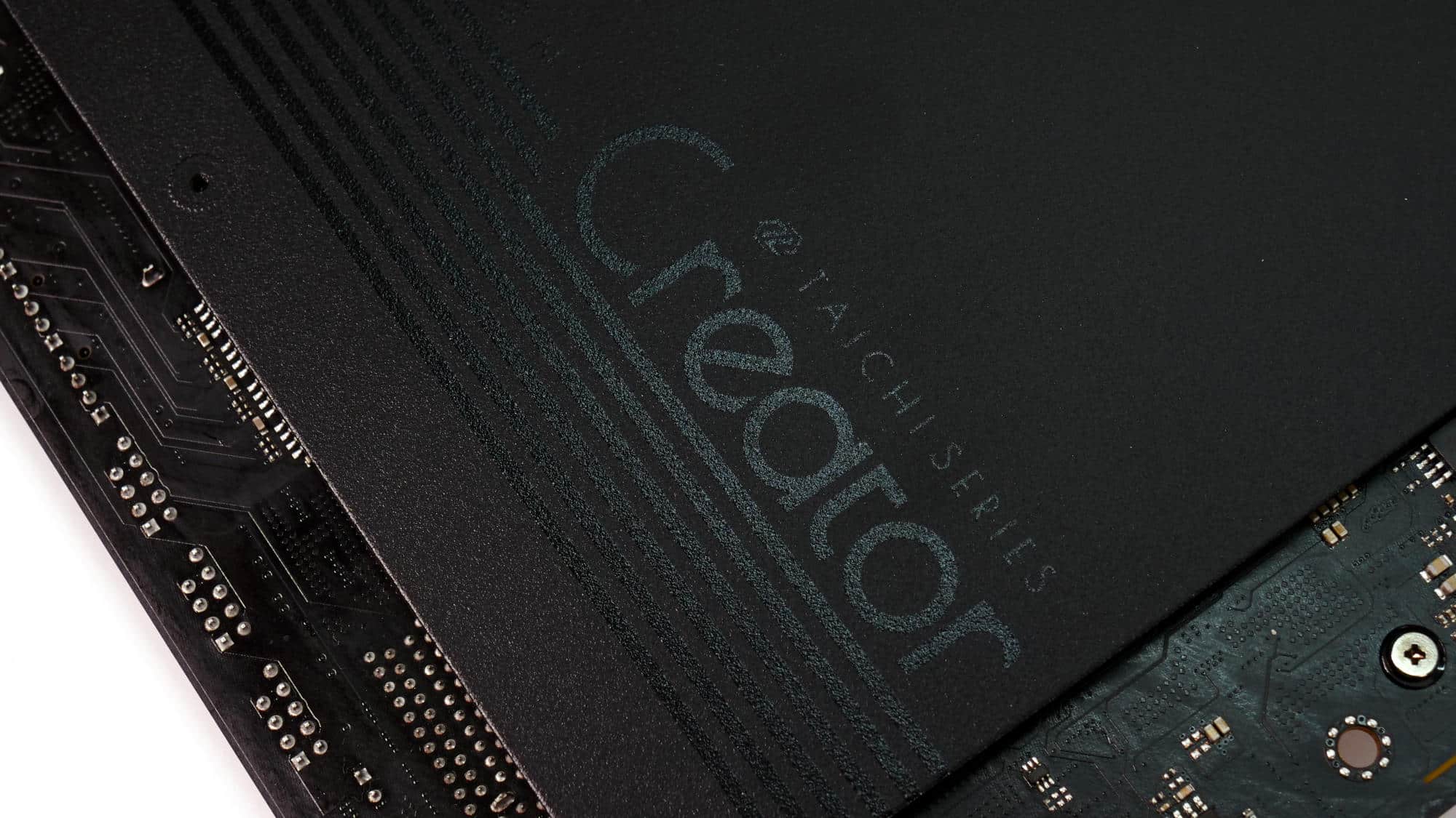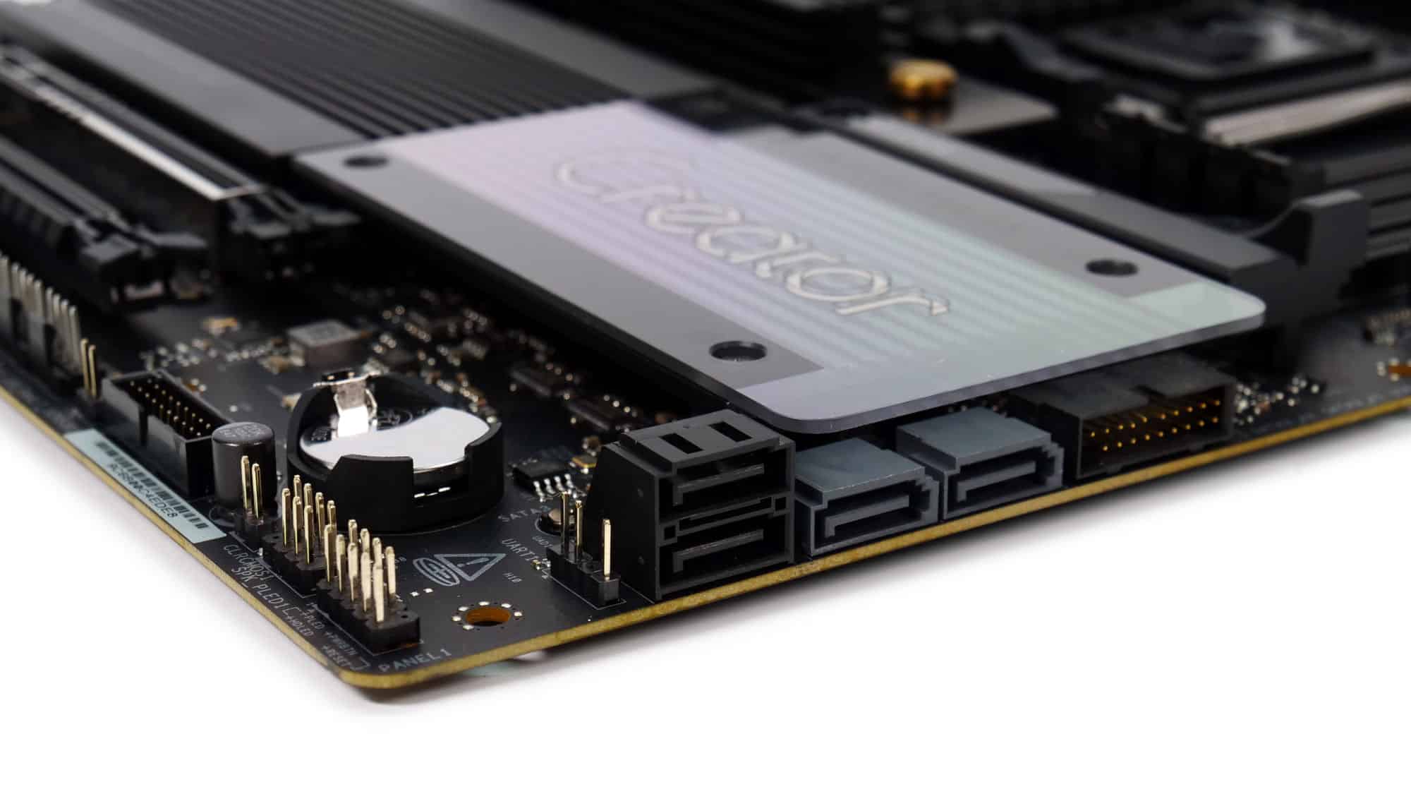 The color scheme of this board is elegant and gives off a premium feel. The design of the VRM coolers is somewhat blocky, but the overall look is very clean. The CMOS battery is a bit of an eyesore, though the acrylic panel with the “Creator” branding stands out nicely, complemented by the M.2 heatsink beside it.