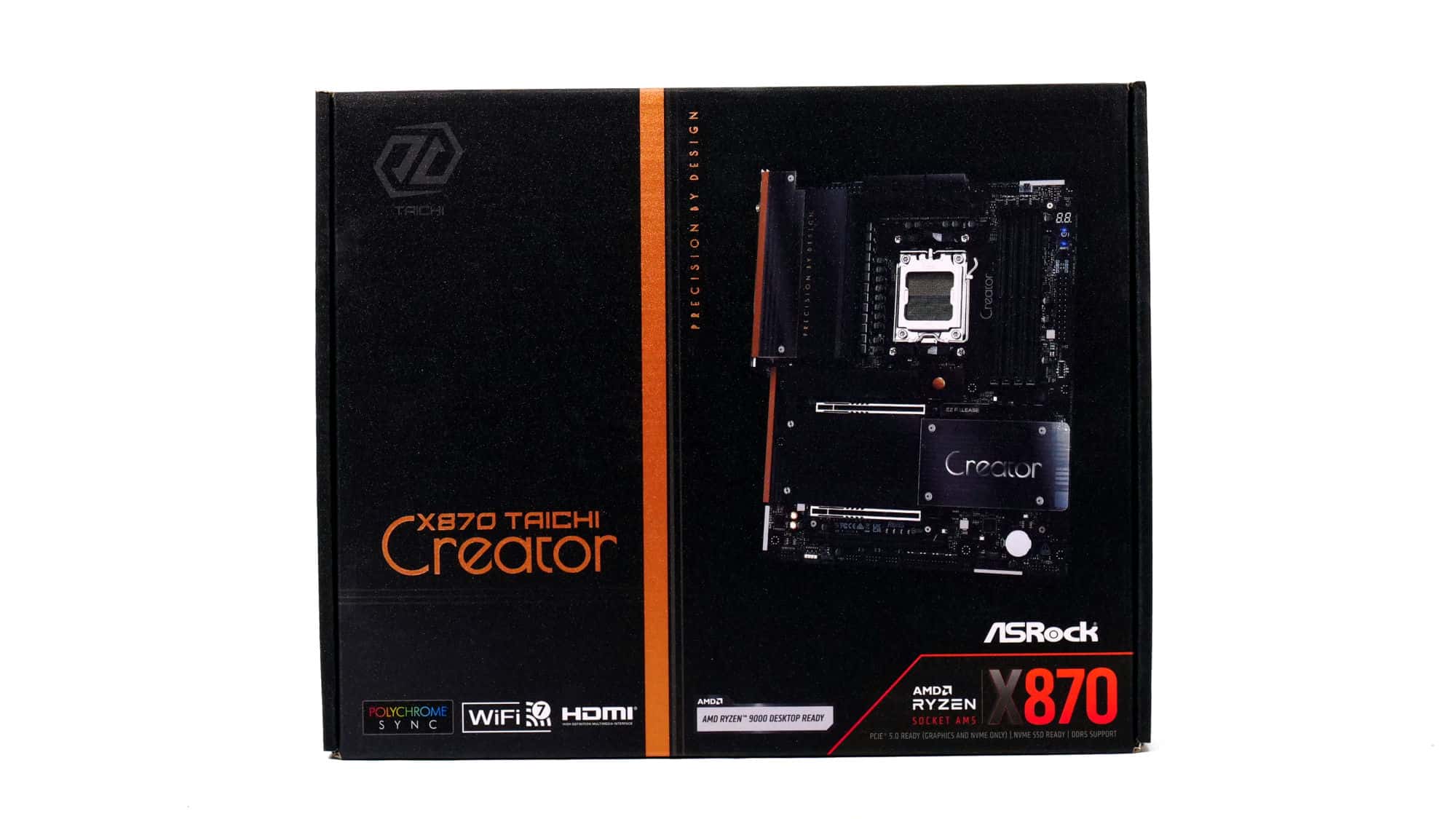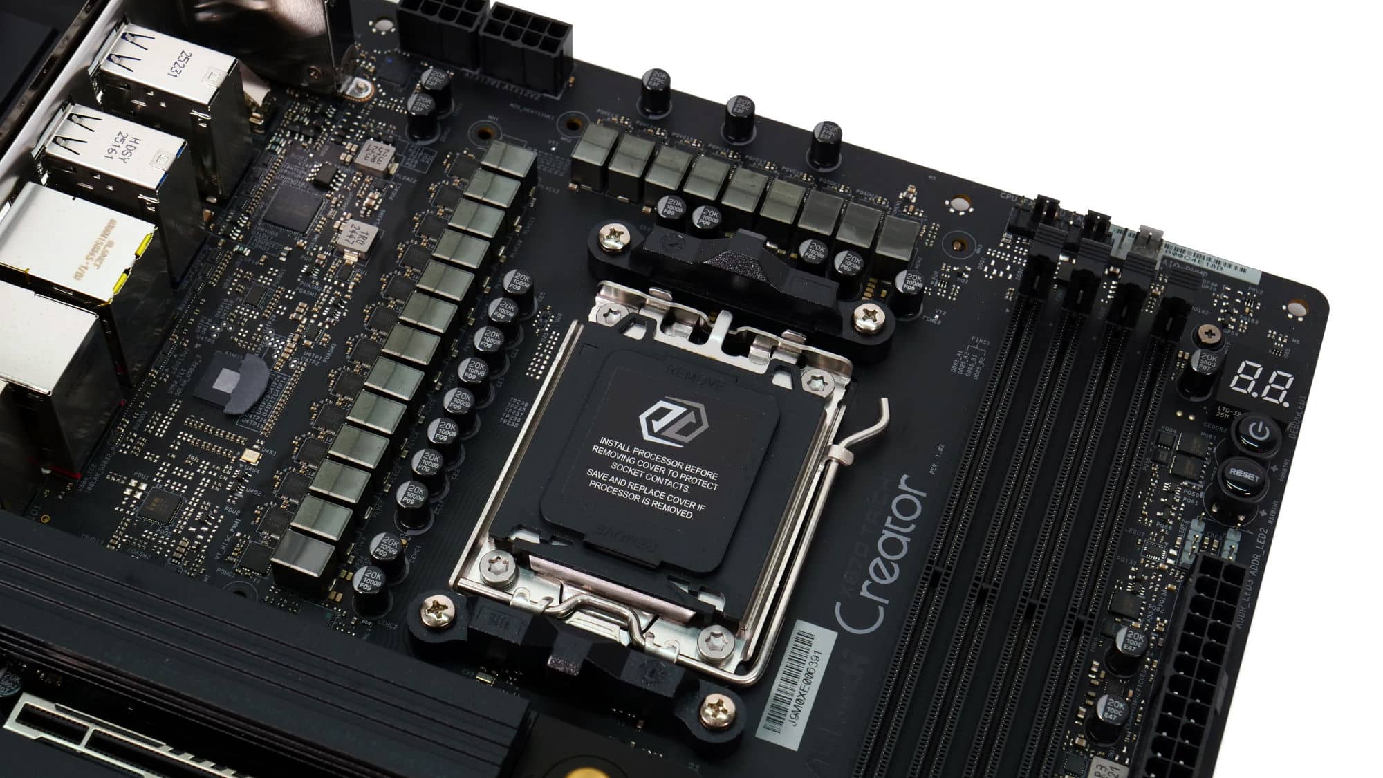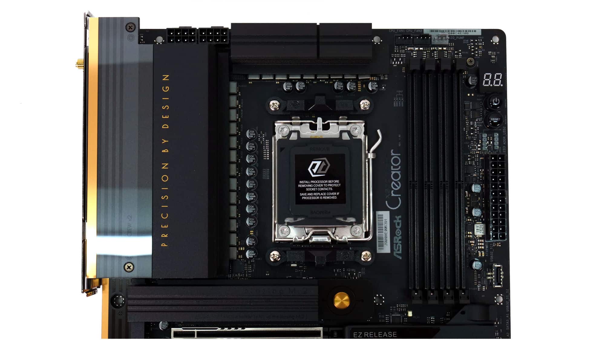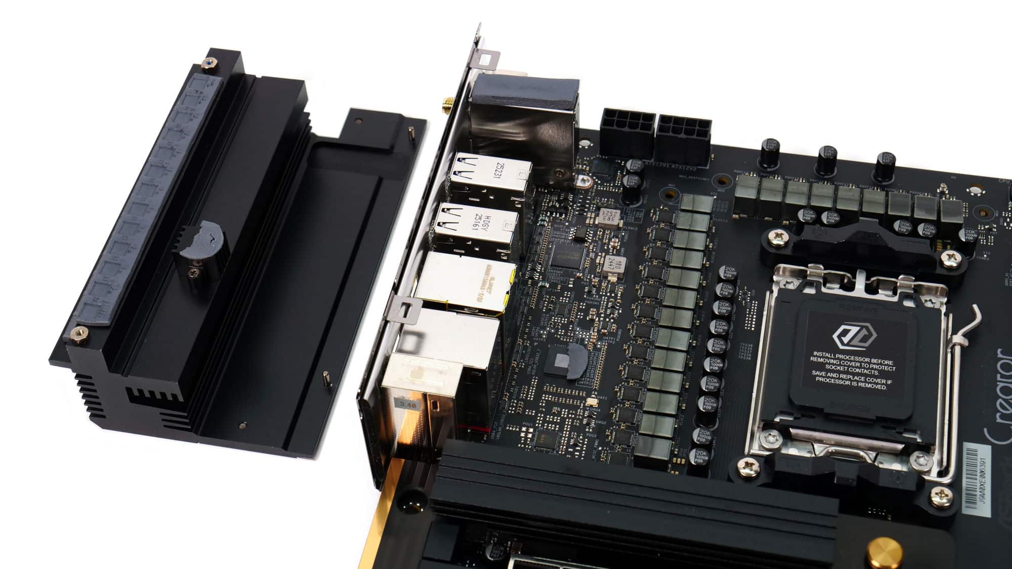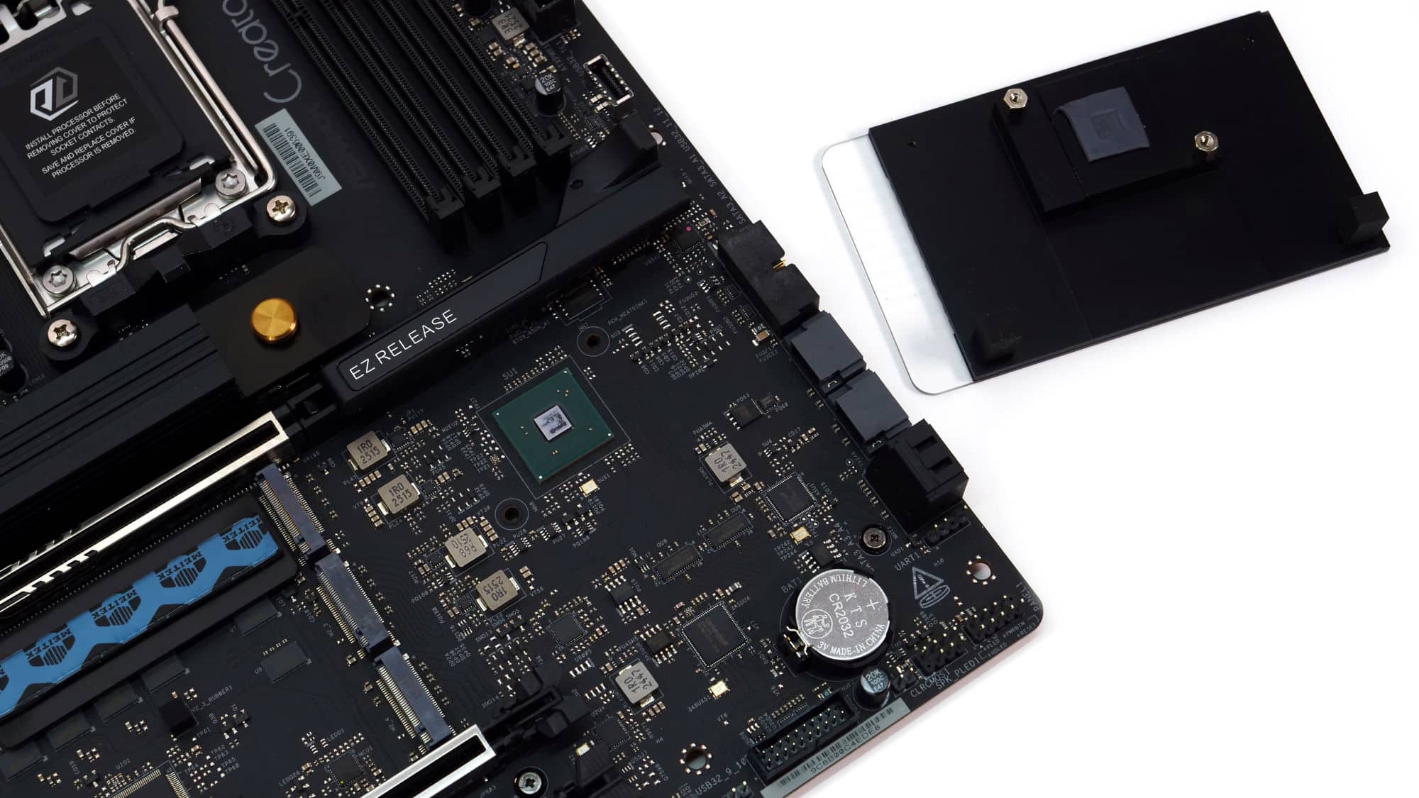 The color scheme of this board is elegant and gives off a premium feel. The design of the VRM coolers is somewhat blocky, but the overall look is very clean. The CMOS battery is a bit of an eyesore, though the acrylic panel with the “Creator” branding stands out nicely, complemented by the M.2 heatsink beside it.