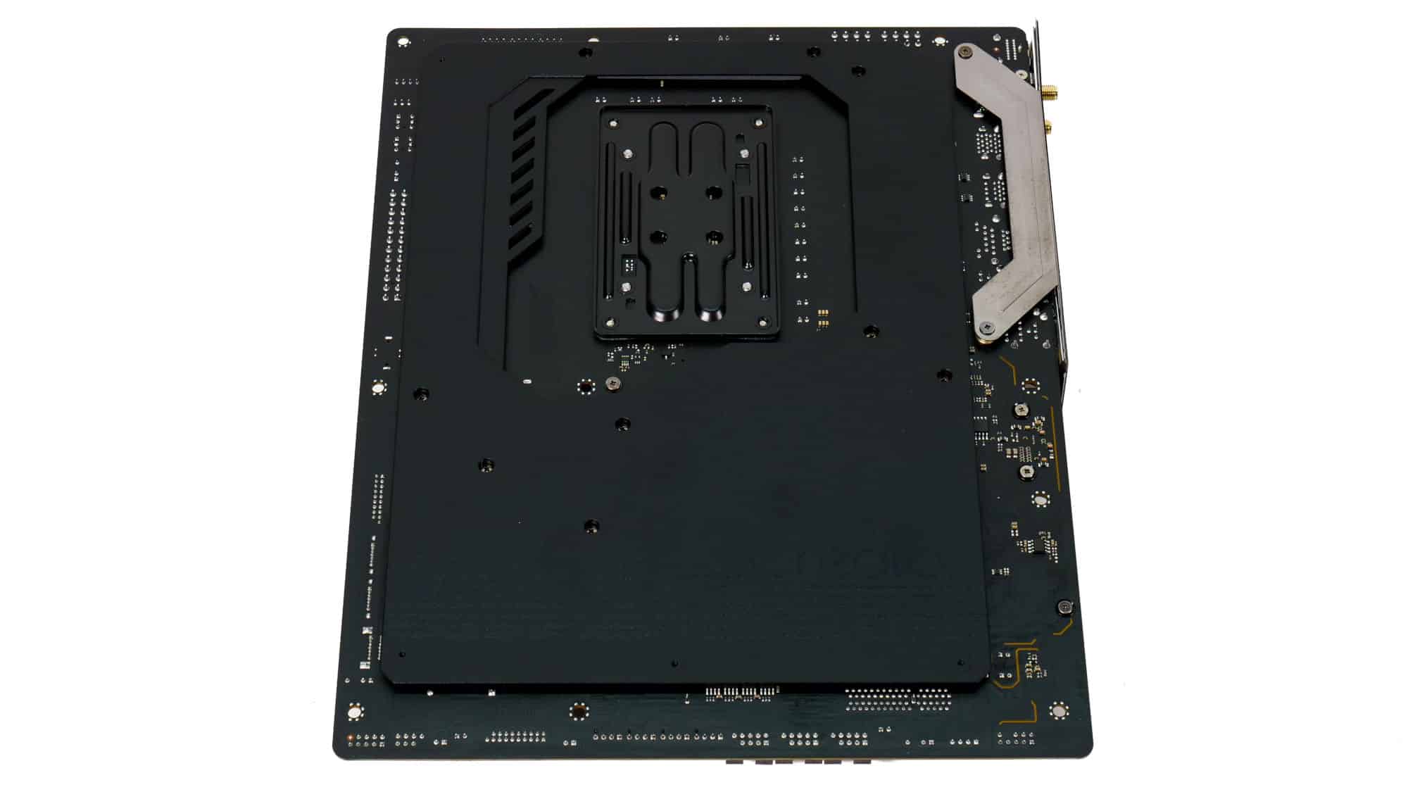 The back of the motherboard features a large metal plate for additional heat dissipation, with thermal pads helping conduct heat away from the M.2 slots and VRMs.