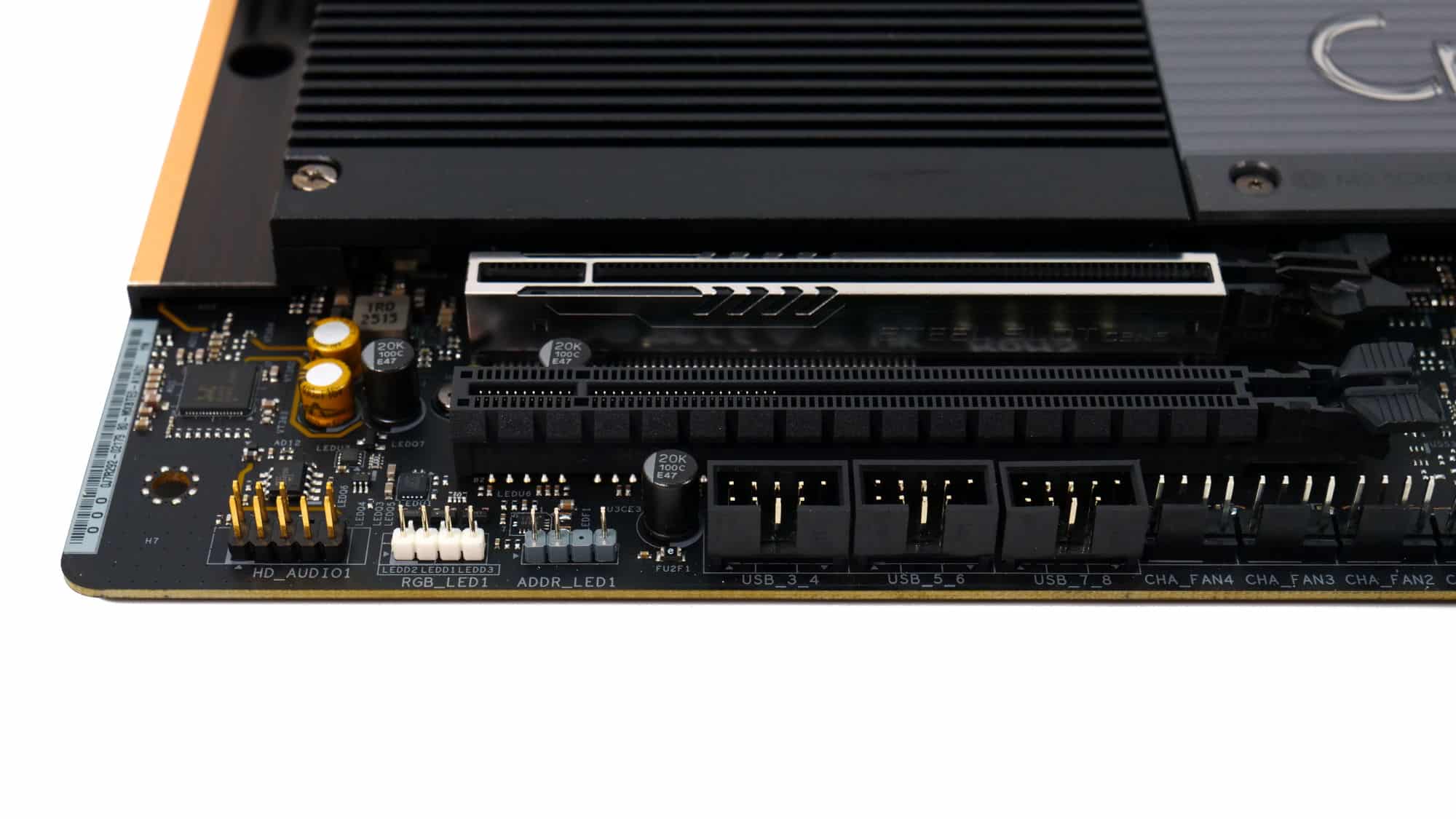 At the bottom of the board, from left to right, you’ll find: an HD audio connector, 12V RGB and 5V ARGB headers, three USB 2.0 9-pin headers, four PWM fan connectors, two additional USB 2.0 headers, a thermistor connector, a 19-pin USB 3.0 connector, a clear CMOS jumper, SATA 3 ports, a Power LED and Speaker header, and the front I/O pins. Next to the SATA 3 ports sits a UART connector that looks like a 5V ARGB header, but it’s not! The only giveaway is the color of the plastic base: 5V ARGB headers are light gray.