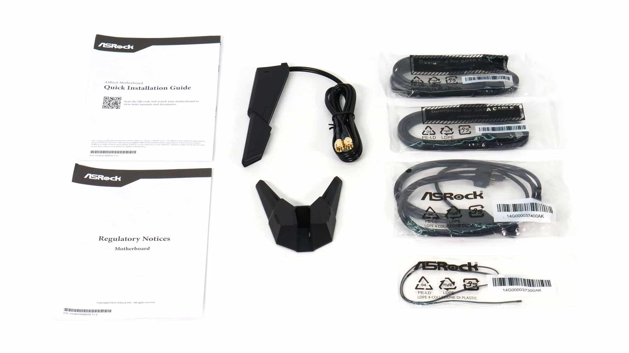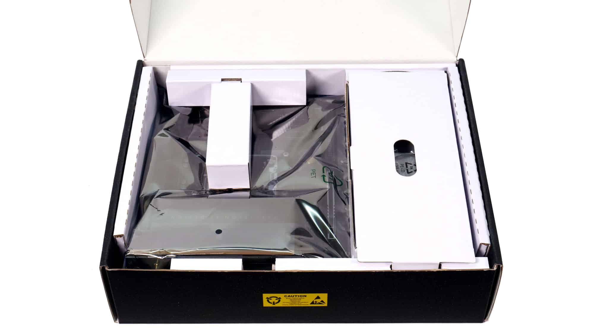 The unboxing experience follows ASRock’s classic approach. The board is well protected with cardboard bracing and an antistatic bag. Along with the motherboard, you’ll find the usual accessories neatly packed inside: