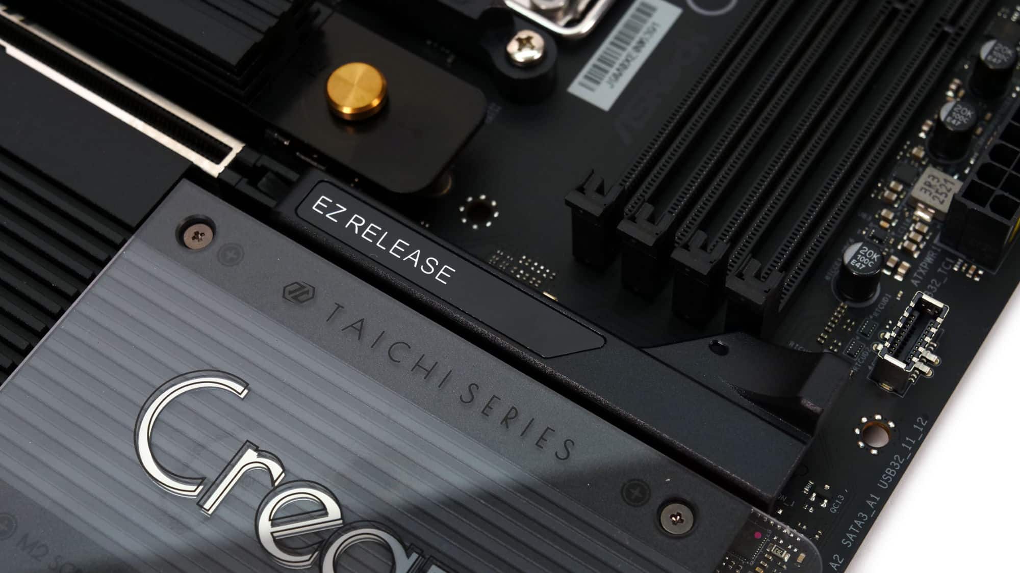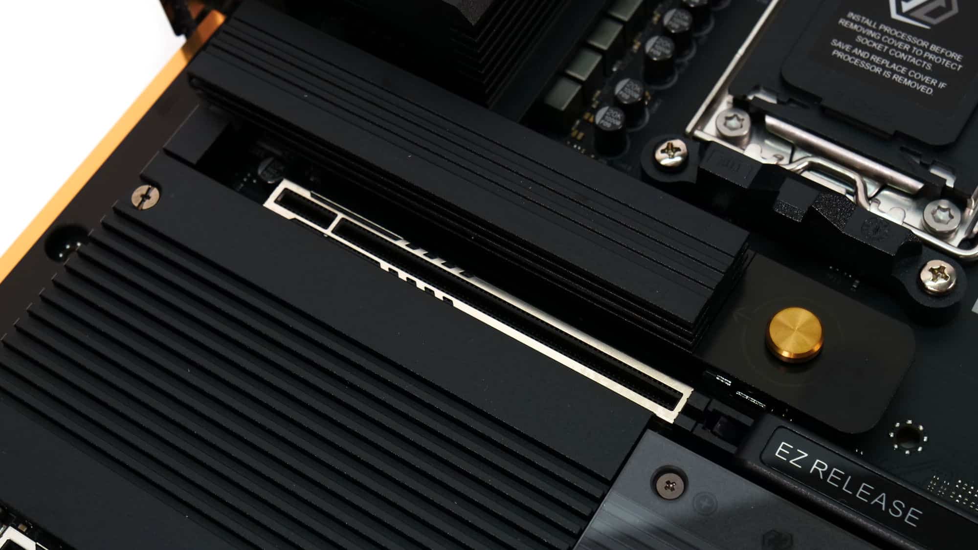Below that, you’ll find the main PCIe 5.0 x16 slot using ASRock’s EZ Connect release mechanism, a feature we wish every motherboard included.