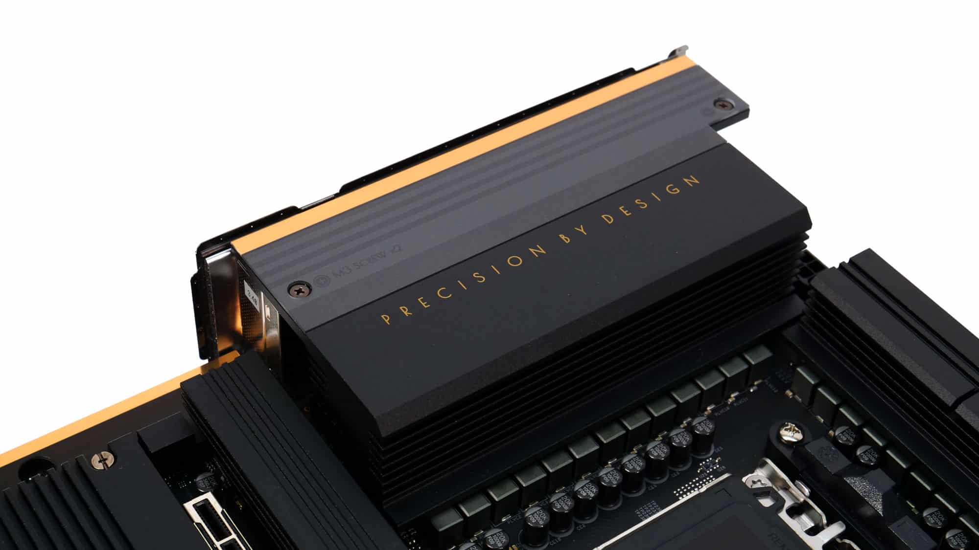 Taking a closer look at the board, the top half houses the dual CPU connectors in the upper-left corner, the VRM heatsinks that cool the 18+2+1 power phases, the CPU socket, and four RAM slots.