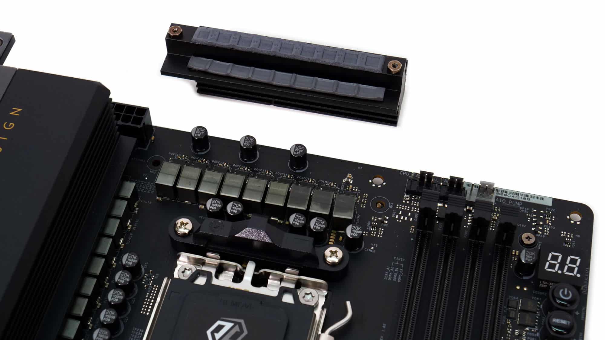 In the top-right corner, there are three PWM connectors, two for CPU fans and one for an AIO pump. You’ll also find the diagnostic screen, onboard power and reset buttons, and two 5V ARGB connectors.