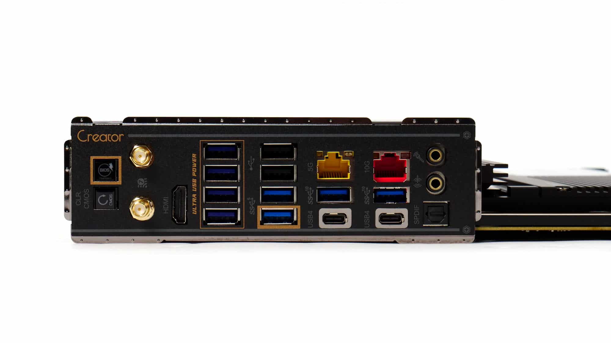 The rear I/O is fully loaded, one of the first boards to include both 10GbE and 5GbE Ethernet ports. Starting from the top, there are two antenna connectors, an HDMI port, six USB 3.2 Gen 1 Type-A ports (5 Gbps, with four supporting USB Ultra Power), two USB 2.0 ports, two USB 3.2 Gen 2 (10 Gbps) ports, two USB4 ports (40 Gbps), the two Ethernet jacks, a line-out, a mic-in, and an SPDIF out port.
