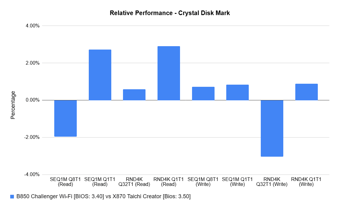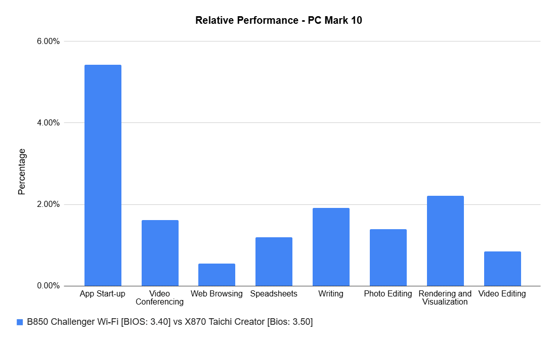 Interestingly, the B850 performed marginally better in some cases; most differences were under 2%, with only app startup showing around a 6% lead. You can access the Creator results here, and the Challenger results here.