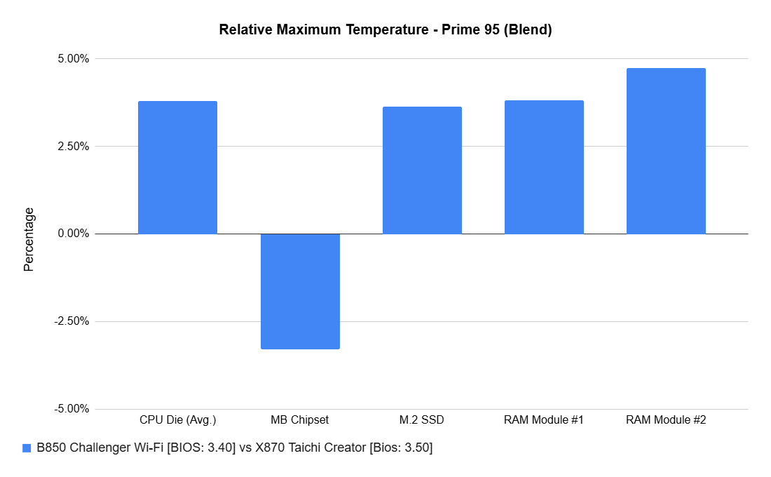 The charts show maximum temperatures on key components, followed by a relative comparison. Aside from the chipset, all hardware was identical. The B850 board ran slightly hotter.