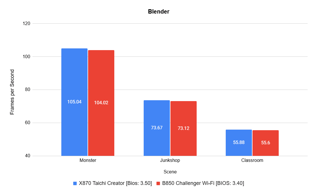 Blender is another test used to evaluate how the motherboard handles sustained, compute-heavy 3D rendering workloads, where VRM design and thermal handling can make a difference. The X870 once again performed well.