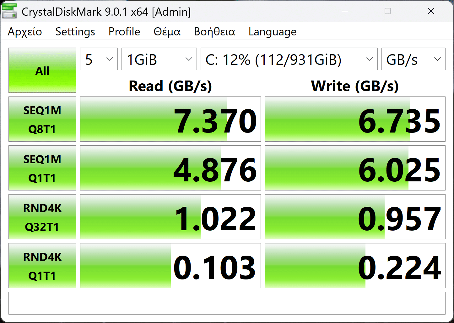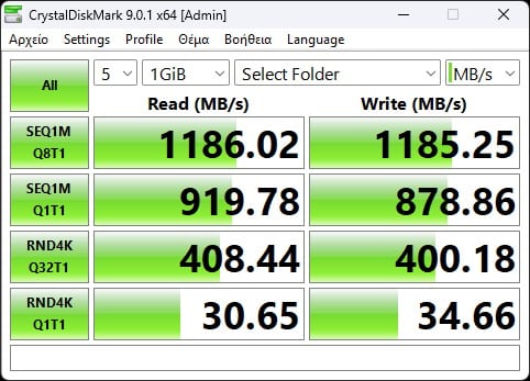 CrystalDiskMark measures storage performance, running sequential and random read/write tests to evaluate how quickly your system can move data, whether you’re loading massive files or thousands of small ones. Keep in mind, the NVMe drive we used is very fast, but not fast enough to saturate the slot.