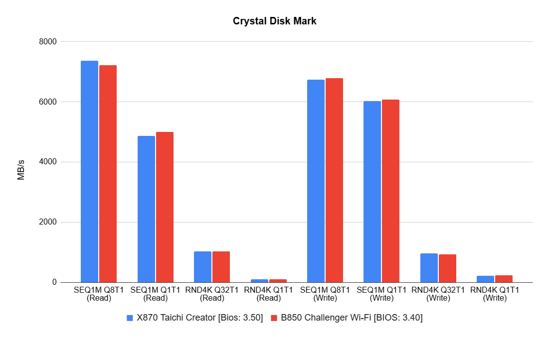 In storage benchmarks, the B850’s SEQ1M Q8T1 and RND4KQ32T1 tests were slower than the X870’s, though the differences weren’t significant.