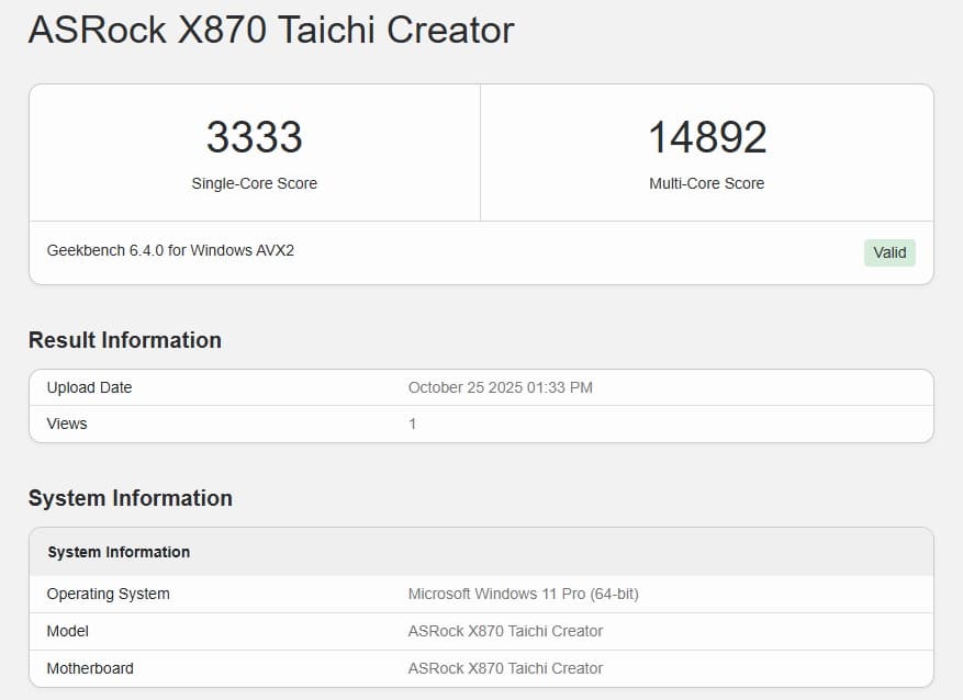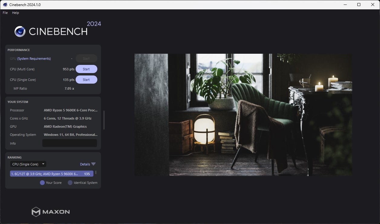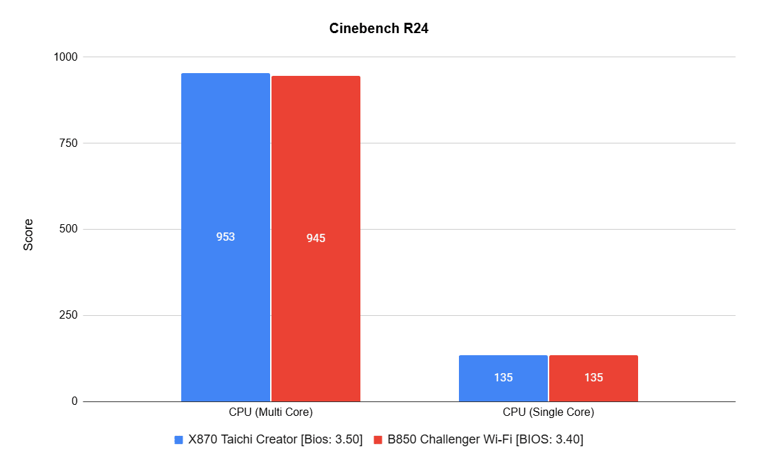 Cinebench R24, powered by the Cinema 4D engine, focuses purely on CPU horsepower. Here, the X870 reached 953 points in multi-core, the highest result we’ve seen from our 9600X so far.