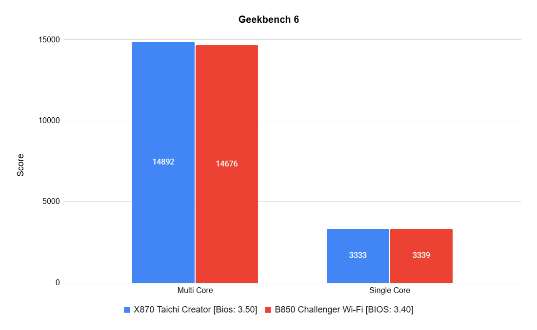 Geekbench 6 covers a wide range of mathematical and real-world tests, including image processing and machine learning. Another helpful feature is the ability to compare performance across different architectures. Once again, multi-core performance improved slightly, while the B850 held a tiny edge in single-core. You can check the X870 results here, and the B850 results here.