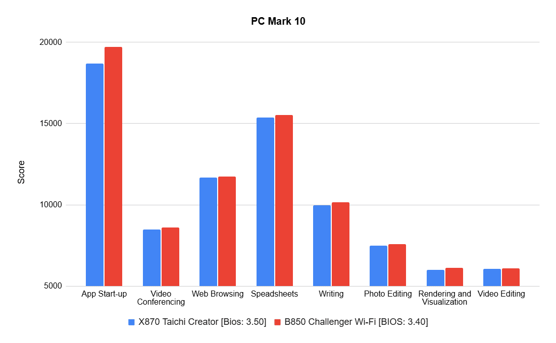 Interestingly, the B850 performed marginally better in some cases; most differences were under 2%, with only app startup showing around a 6% lead. You can access the Creator results here, and the Challenger results here.