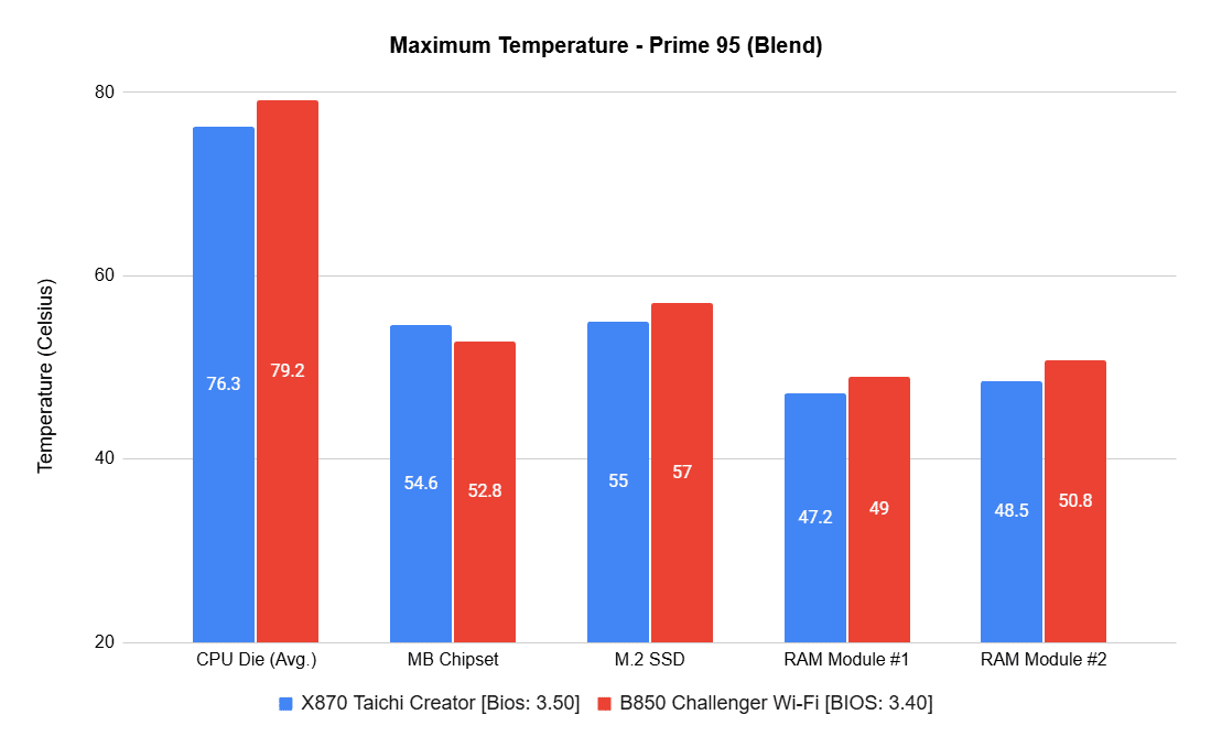 The charts show maximum temperatures on key components, followed by a relative comparison. Aside from the chipset, all hardware was identical. The B850 board ran slightly hotter.
