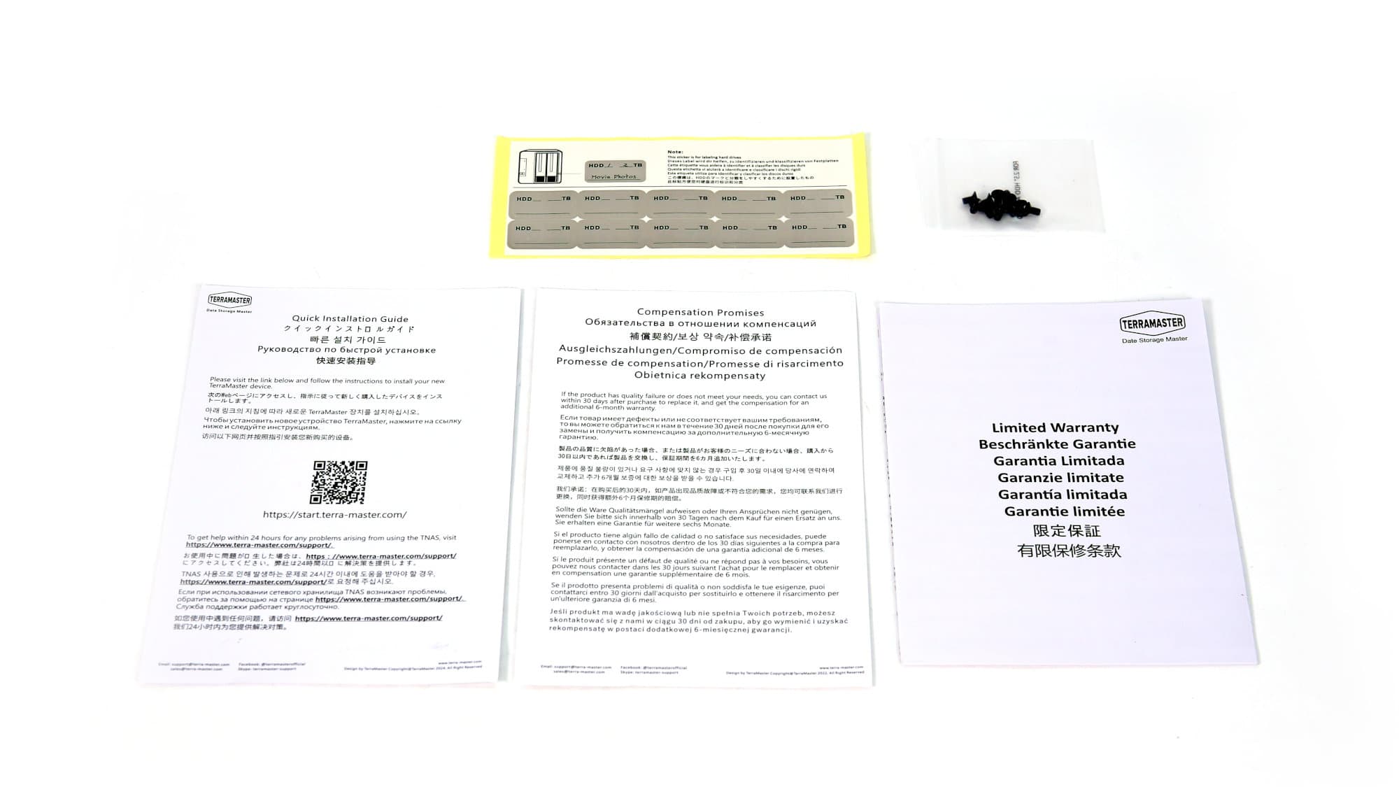 The included drive labels are a thoughtful touch, helping you organize your drives if you frequently swap them. Just remember not to cover the breather hole. Finally, there are three paper leaflets: a Quick Installation Guide, a Limited Warranty, and a uniquely named “Compensation Promises” leaflet. The latter outlines TerraMaster’s commitment to replace defective products and provide an additional six months of warranty coverage for them.