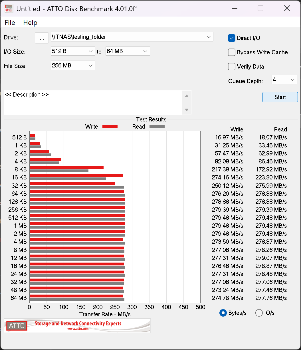 To evaluate the performance of our NAS setup over a 2.5GbE connection, we used ATTO Disk Benchmark and CrystalDiskMark to run a series of read and write tests.