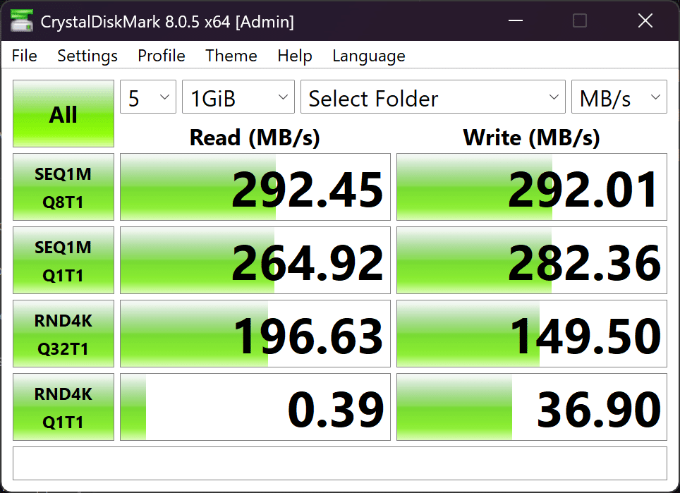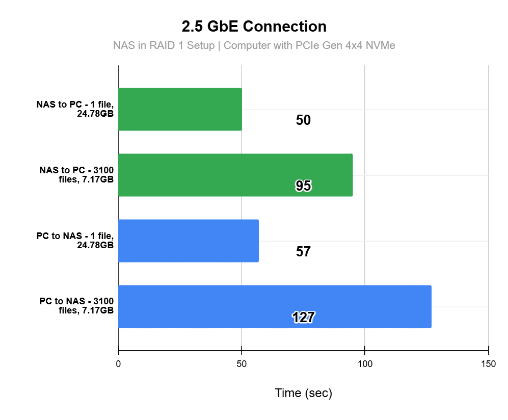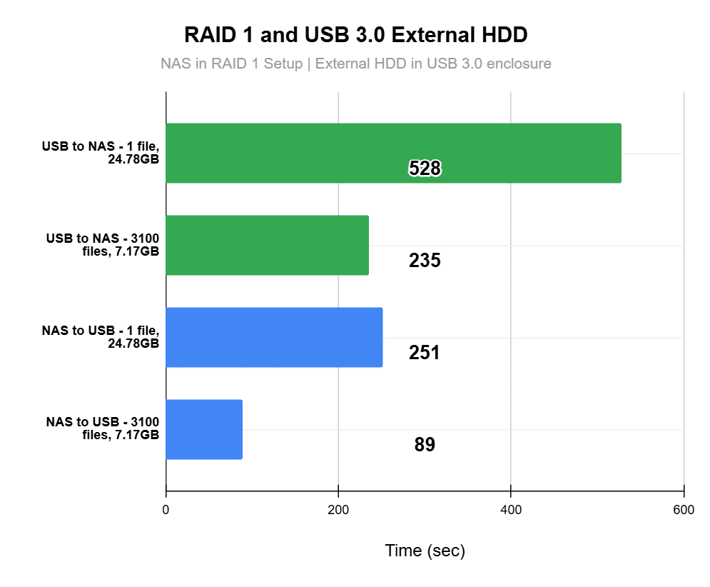 From our testing, it’s clear that the NAS’s internal configuration doesn’t really affect transfer speeds when using this particular external USB device. The external drive itself hits its performance ceiling long before the NAS does. In fact, the drive only manages to use about half of the available bandwidth of the NAS’s USB ports. While the NAS supports 10Gbps USB 3.2 Gen 2, the external drive operates on USB 3.2 Gen 1, which tops out at 5Gbps; in practice, the drive’s own speed limit is even lower than that.