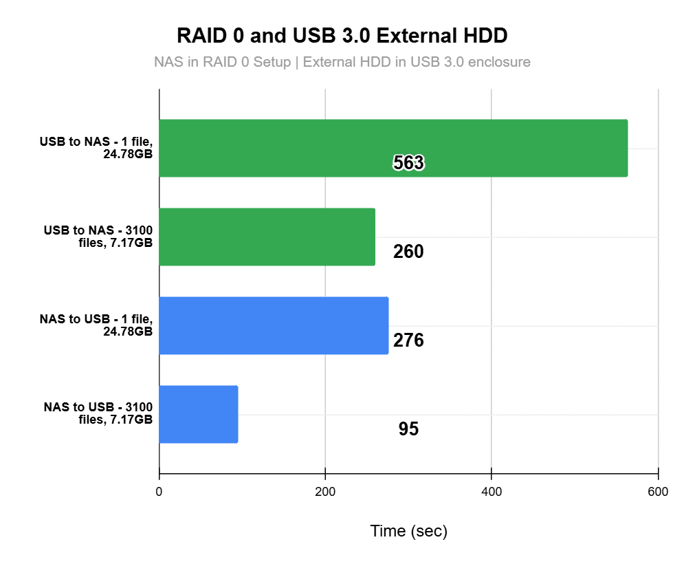Setting up the NAS in a RAID 0 configuration didn’t significantly affect performance in the USB setup, supporting the earlier observation that the USB device is the bottleneck in this scenario.
