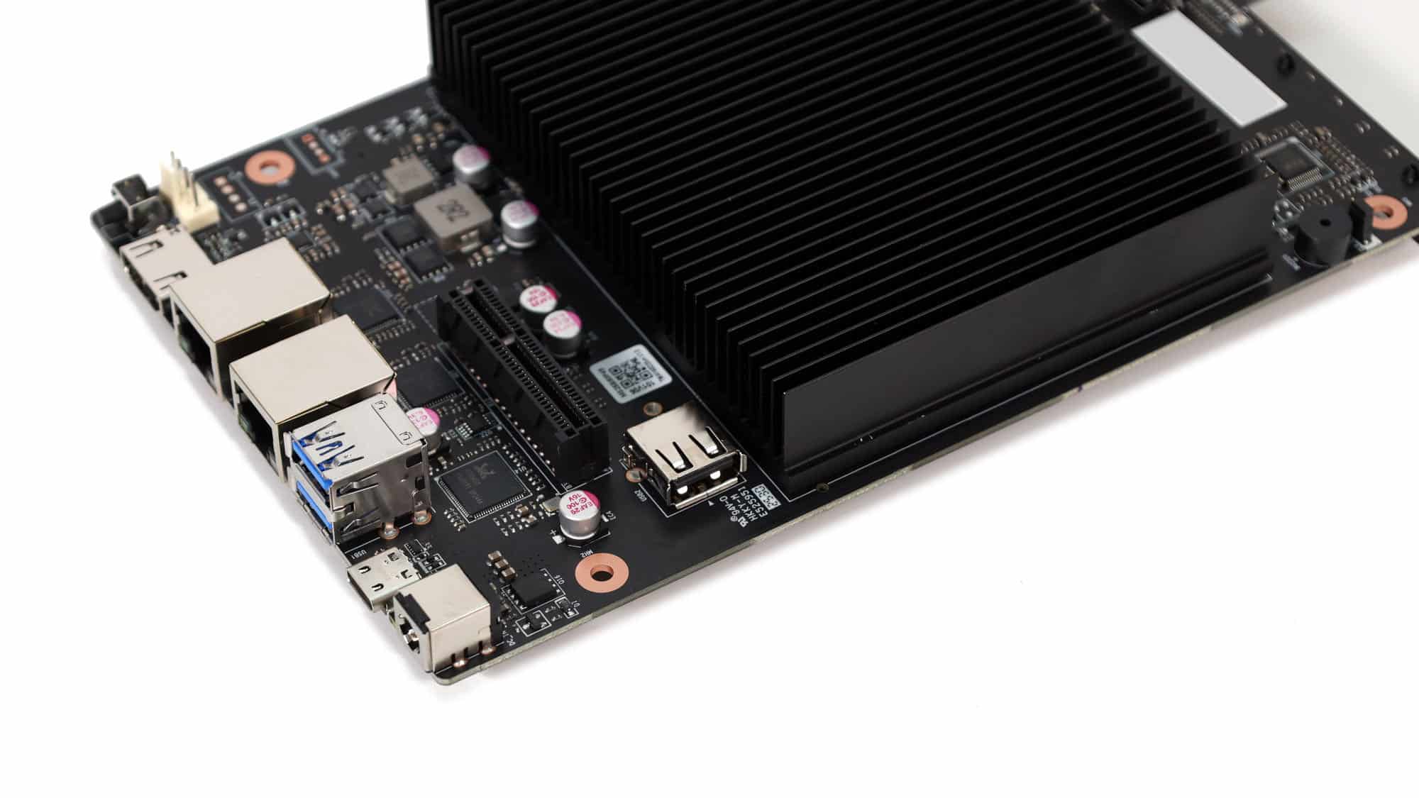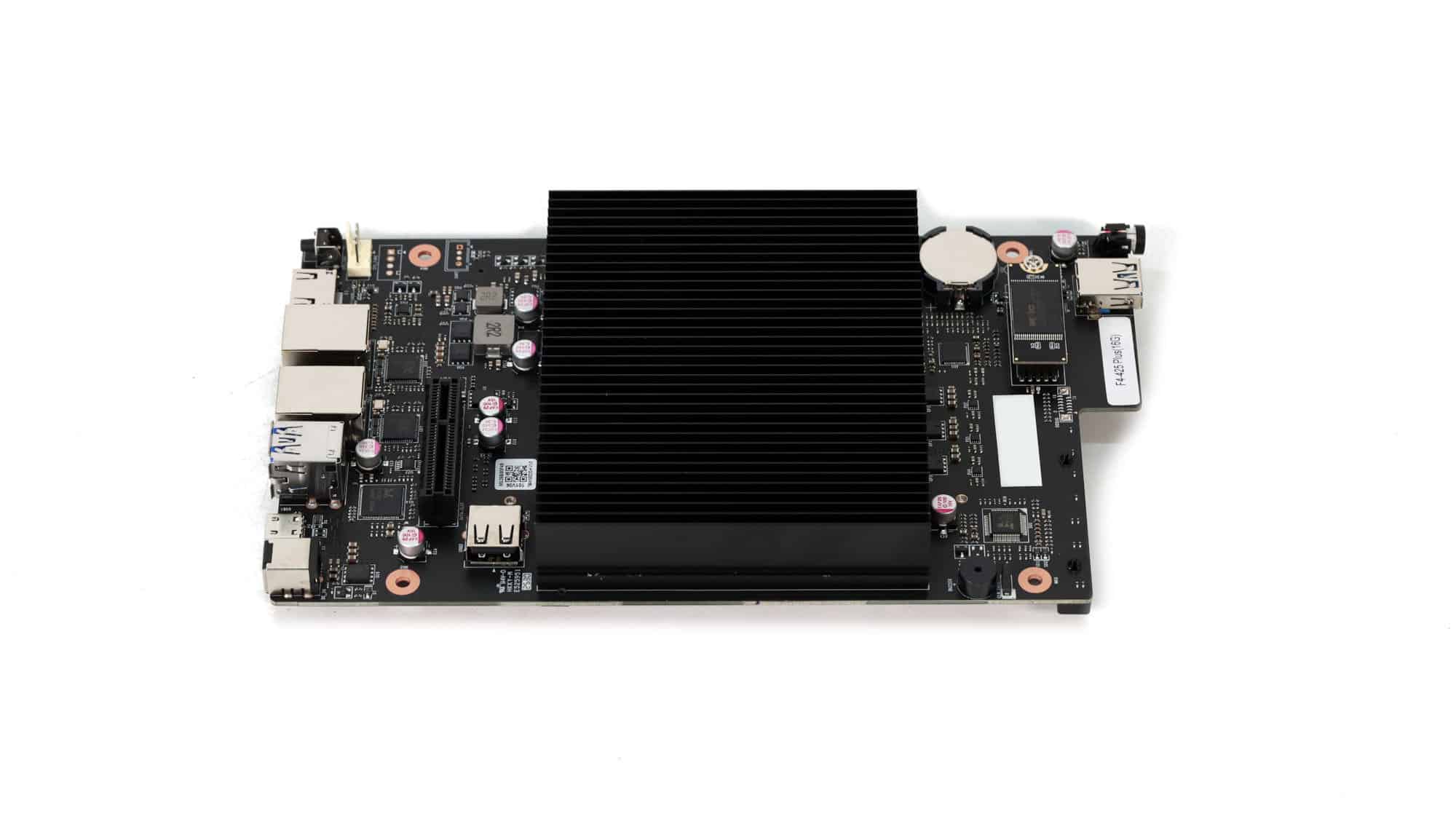 The motherboard is the final piece of the puzzle. It’s a flat, mostly orthogonal board, with a large portion covered by a long, low-profile heatsink designed to cool the Intel N150. All I/O ports and buttons are soldered directly onto the board, with the only separate component being a daughterboard used to interface with the SATA drives.