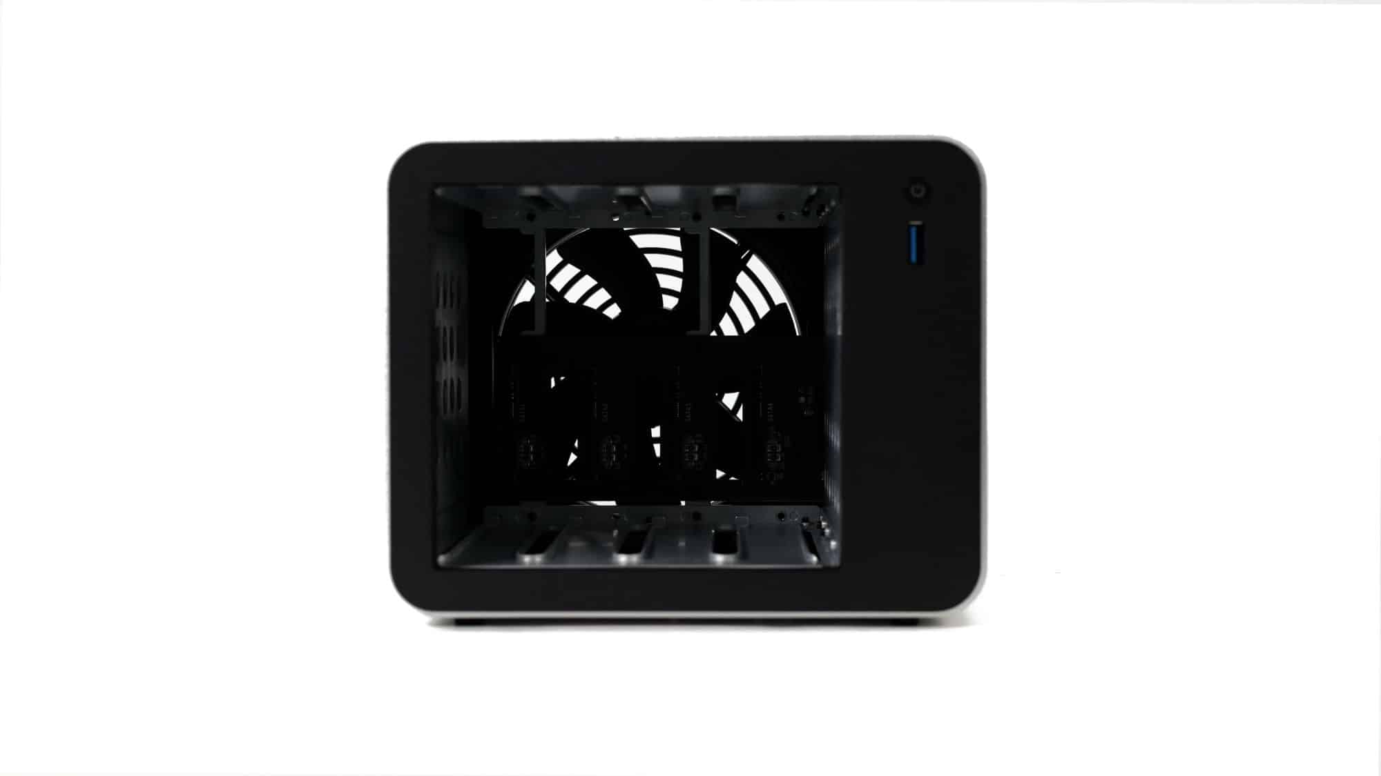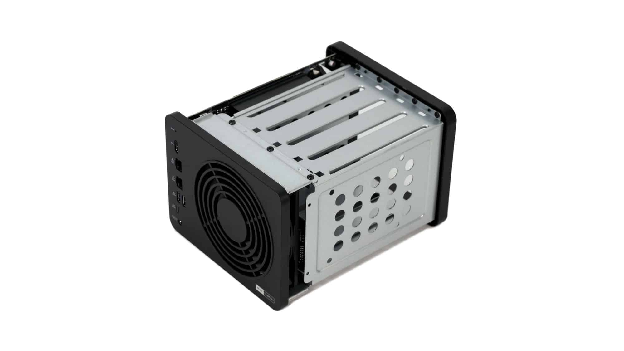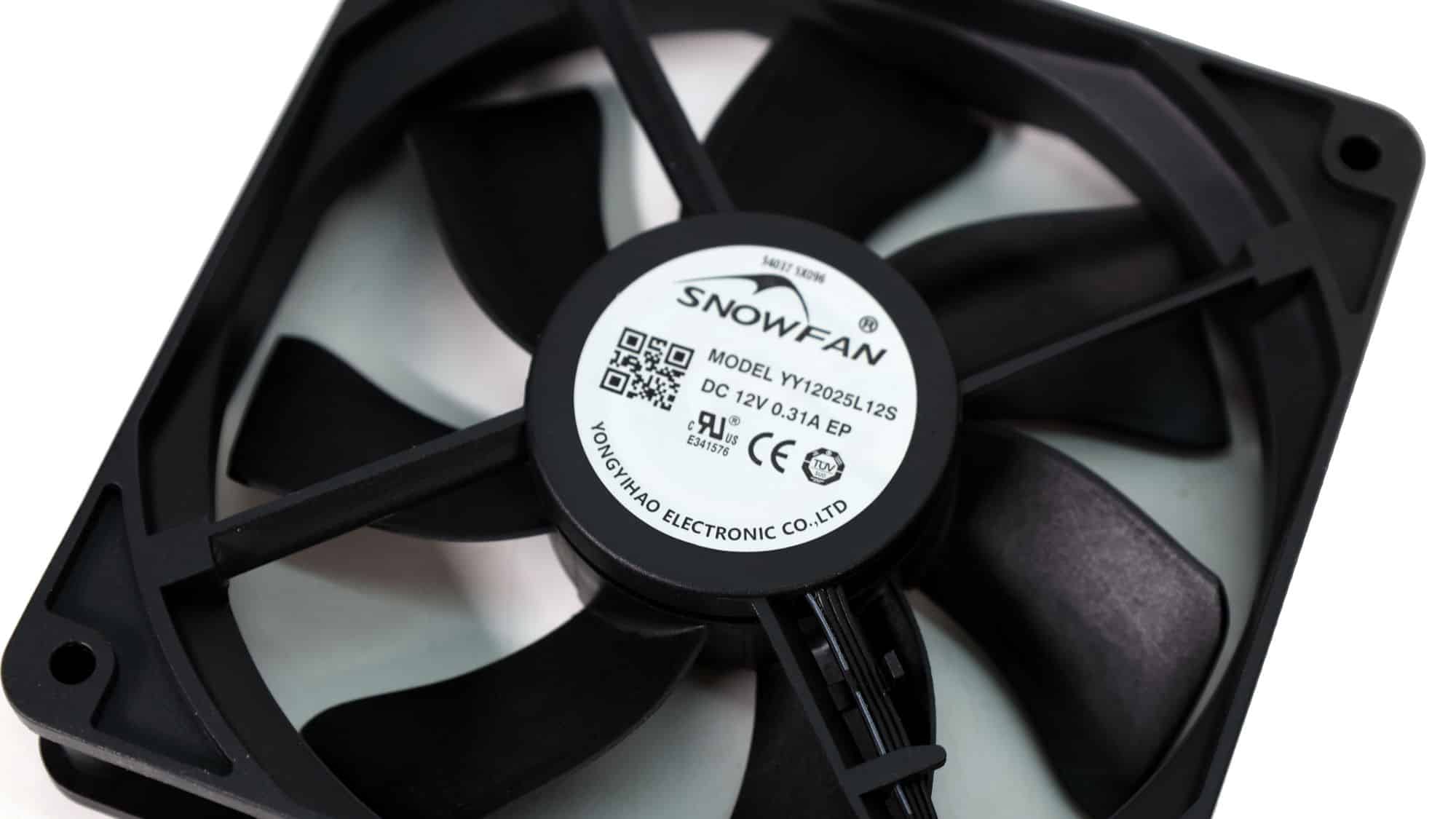 After sliding the housing off, you gain full 360-degree access to the internals. The interior mainly consists of the metal structure supporting the SATA drive bays, the rear fan, and the main PCB. The rear fan is a SnowFan unit, a brand we’ve consistently seen used across TerraMaster products.