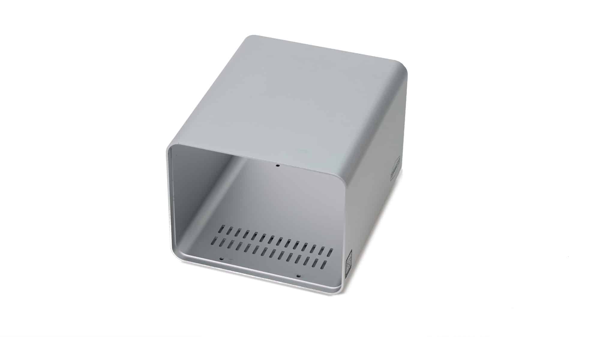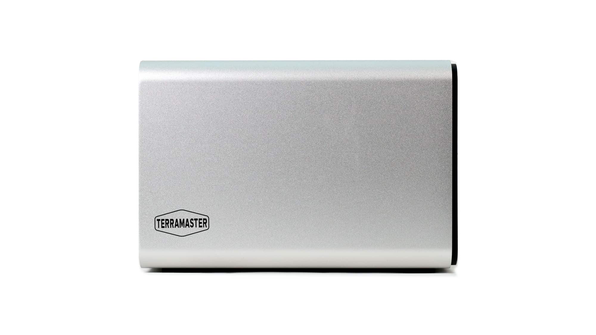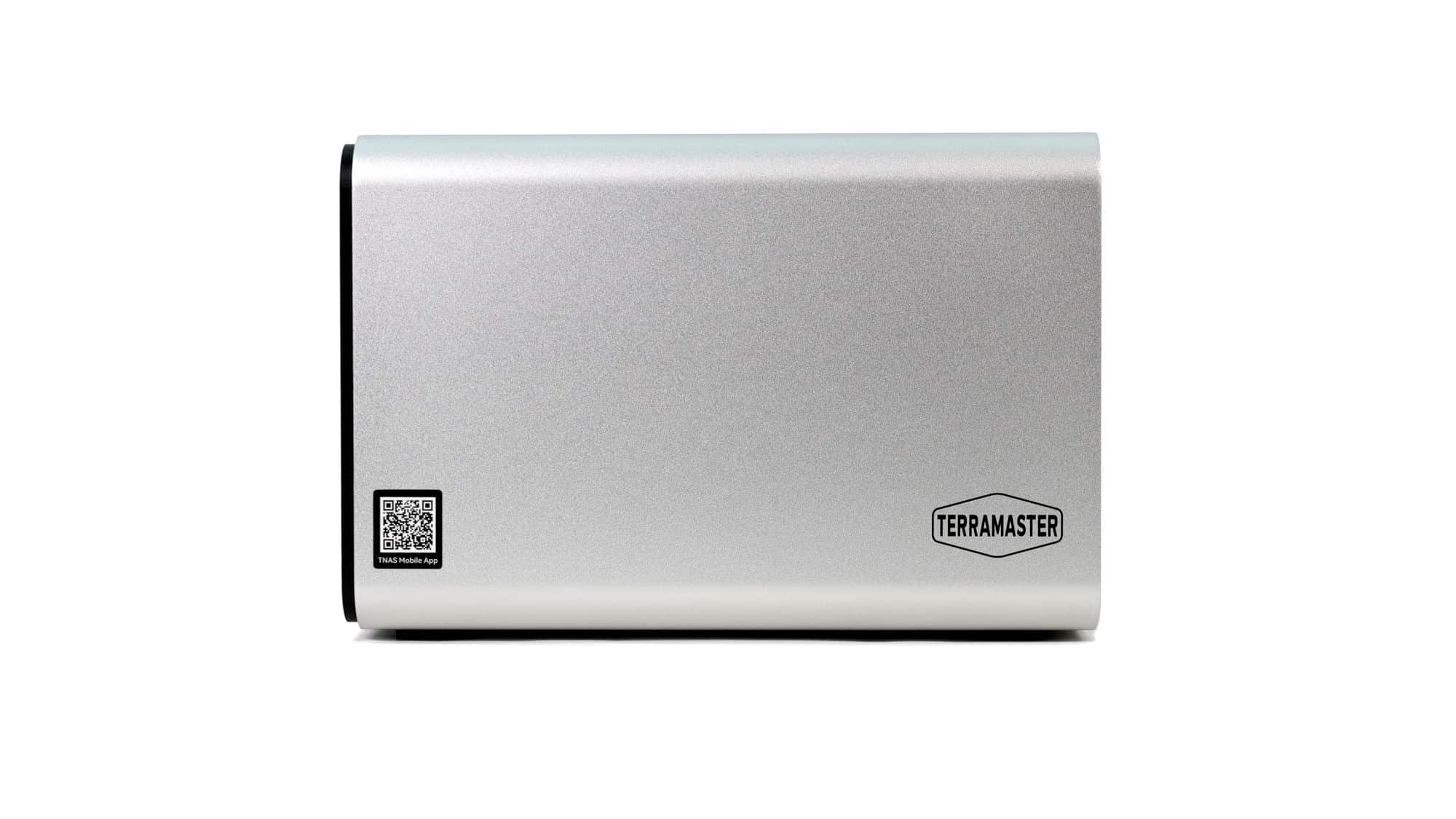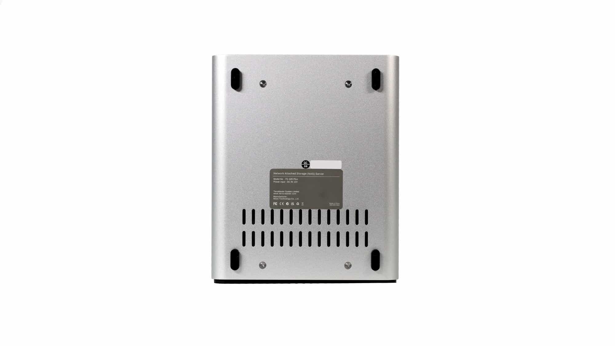 At the rear, you’ll find the main I/O, the cooling fan, and the barrel-jack power connector. The aluminum housing covers the remaining sides. Both sides feature a discreet TerraMaster logo, and one side also includes a QR code to help you get started via smartphone. On the bottom, four rubber feet keep the NAS off the surface and help isolate vibrations. You’ll also find ventilation cutouts and two stickers. The four visible screws are used to remove the housing.