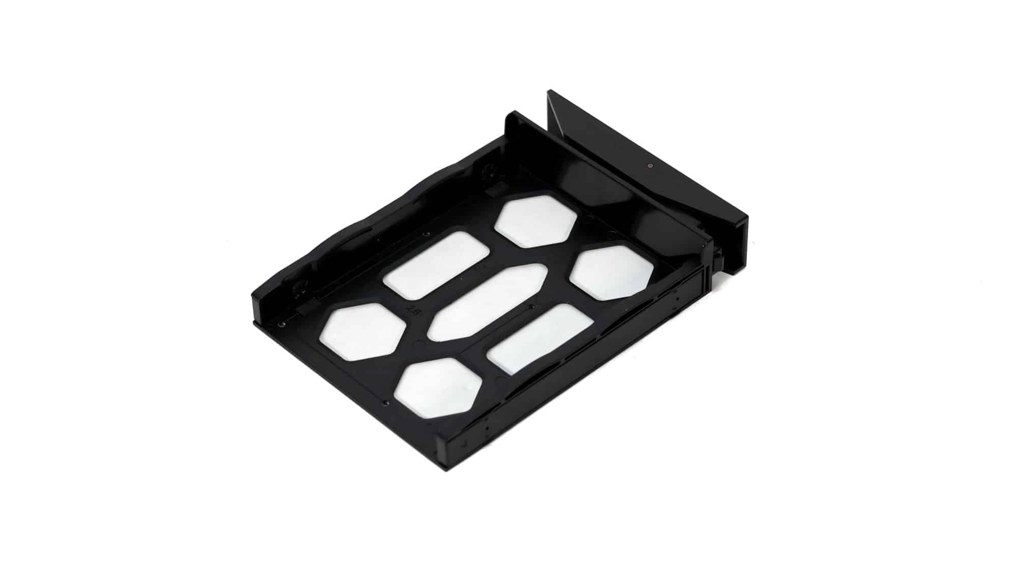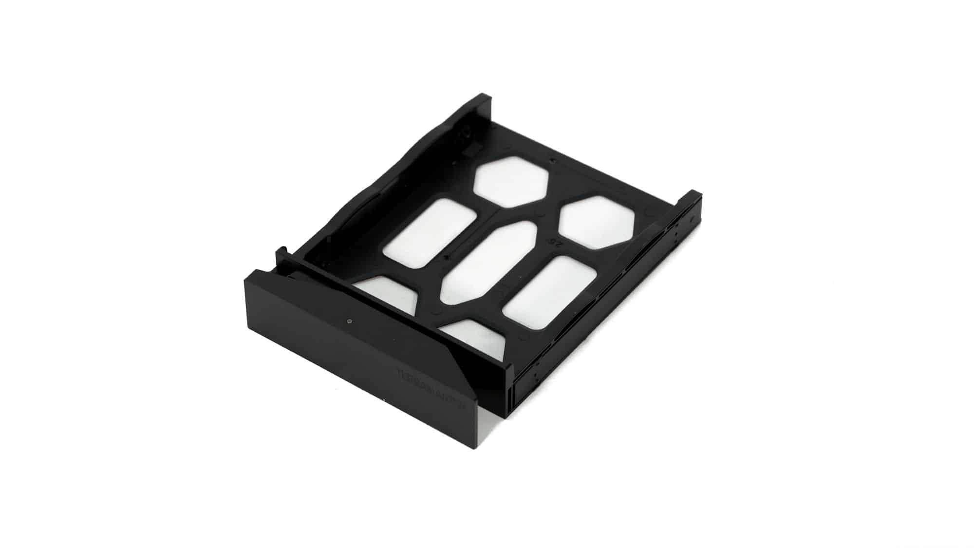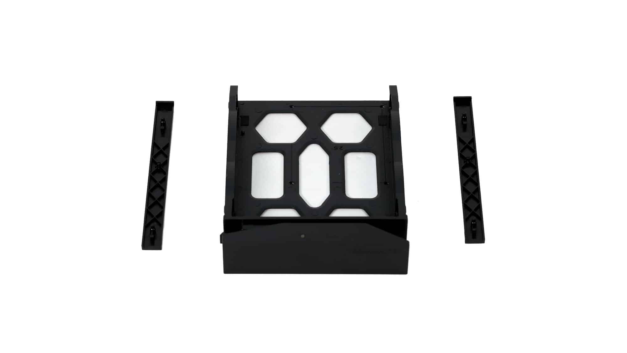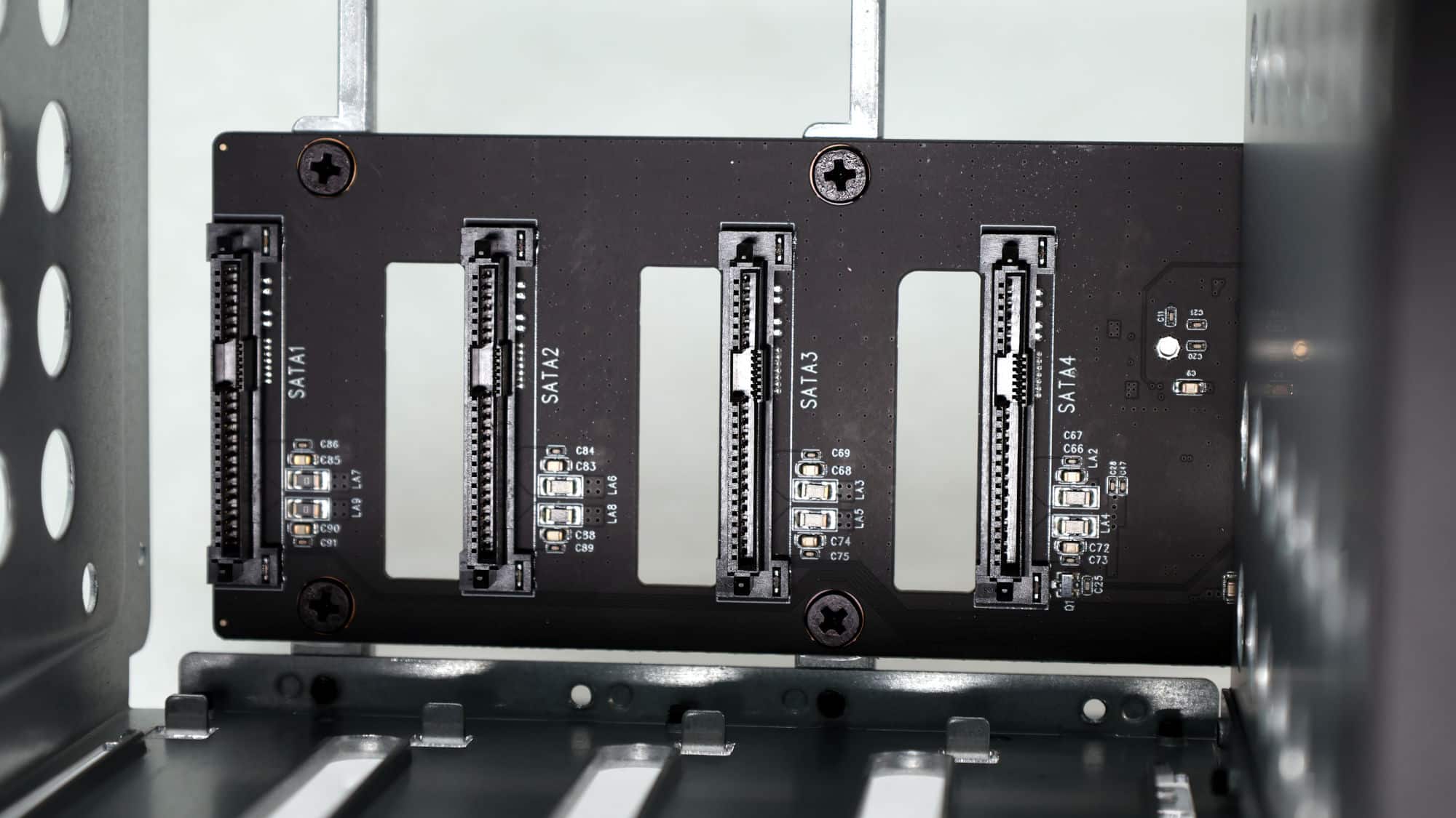 On the front, you’ll find access to the four drive trays, a USB Type-A port (10 Gbps), and the power button. The drive trays are made of plastic, which may feel less premium at first, but plastic helps reduce noise when paired with spinning drives. The trays are easy to remove and replace. Installation for 3.5-inch drives is tool-less: remove the two plastic clips, align the drive, and snap the clips back into place. For 2.5-inch drives, the included screws are required. Overall, both the trays and the tool-less mechanism feel sturdy and easy to use, despite being made of plastic.