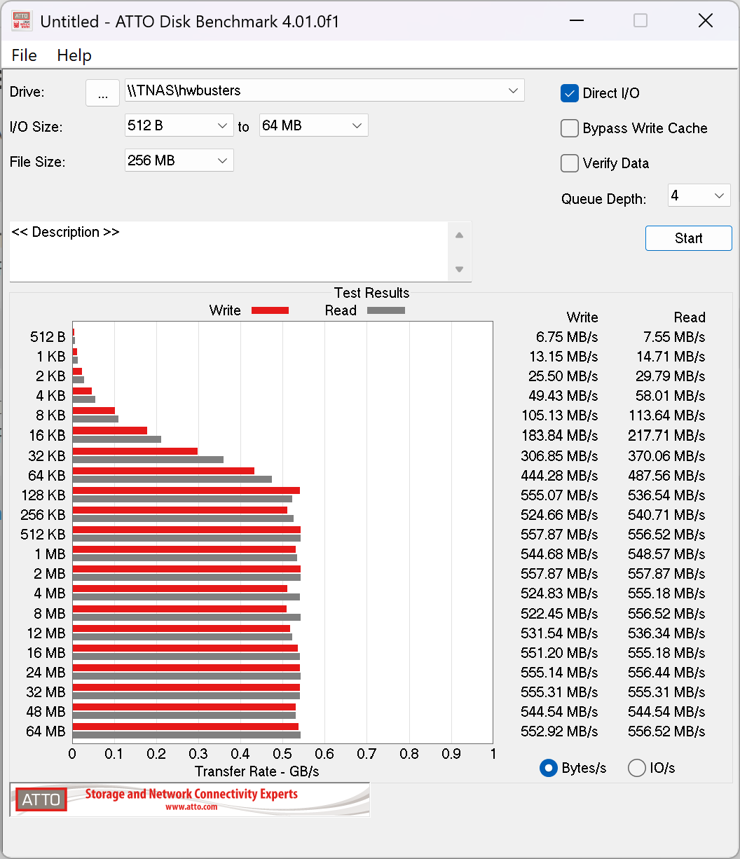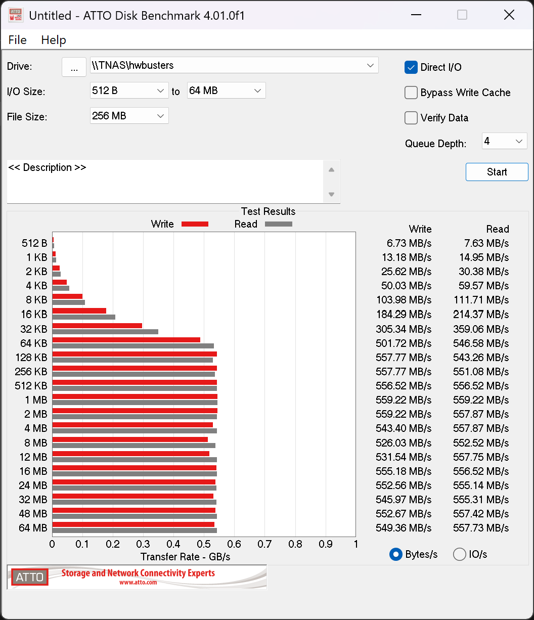 To evaluate the performance of our NAS setup over a 5GbE connection, we used ATTO Disk Benchmark and CrystalDiskMark to run a series of read and write tests. First, let’s take a look at the results from ATTO. While you can notice a difference, it is minimal.