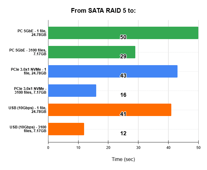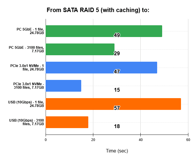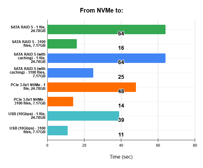Both file types transferred faster when written to another NVMe drive than in either RAID configuration. Lastly, copying to the USB drive was the fastest overall, with the most noticeable difference observed during the transfer of the large file.