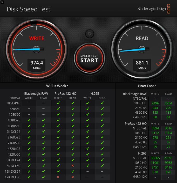 - Write Speeds: 881.1 MB/s