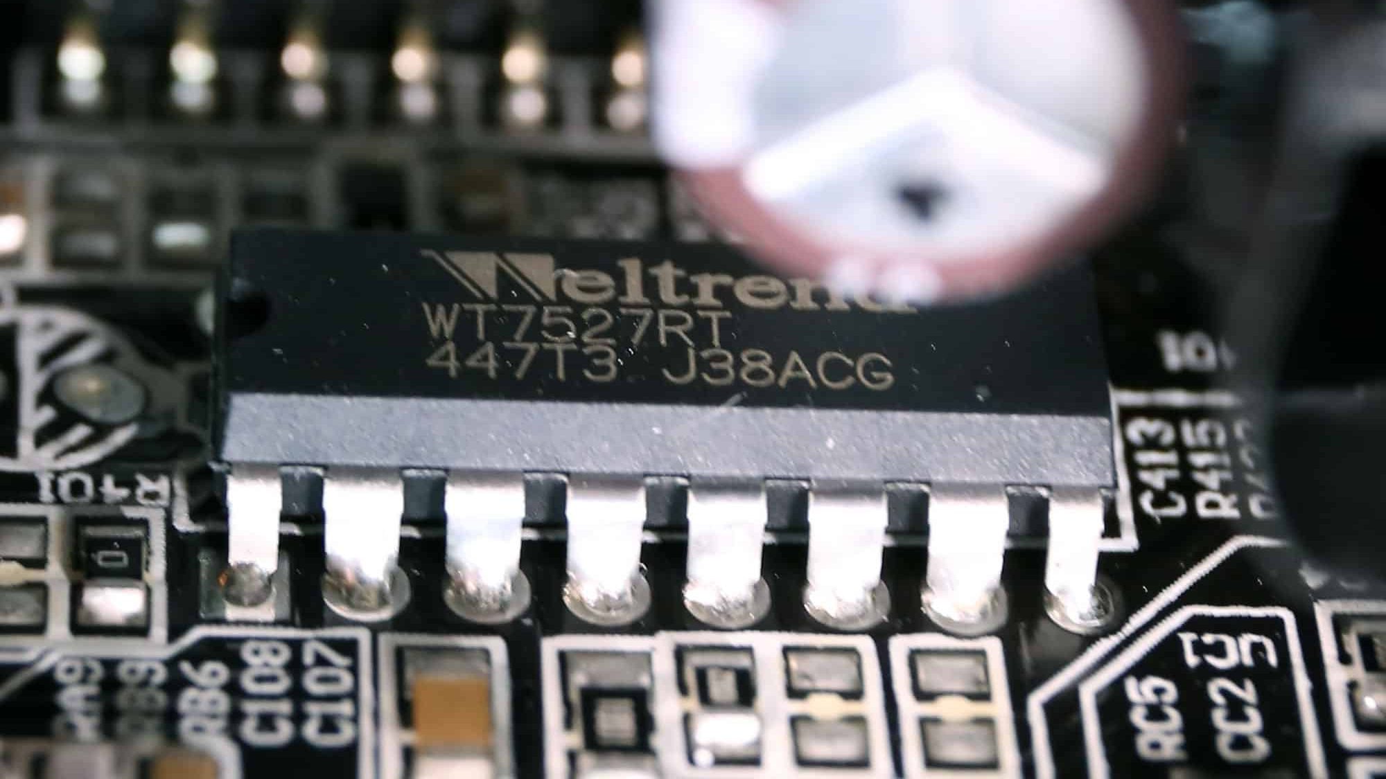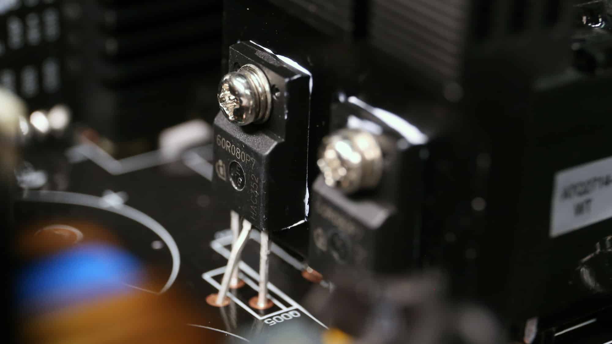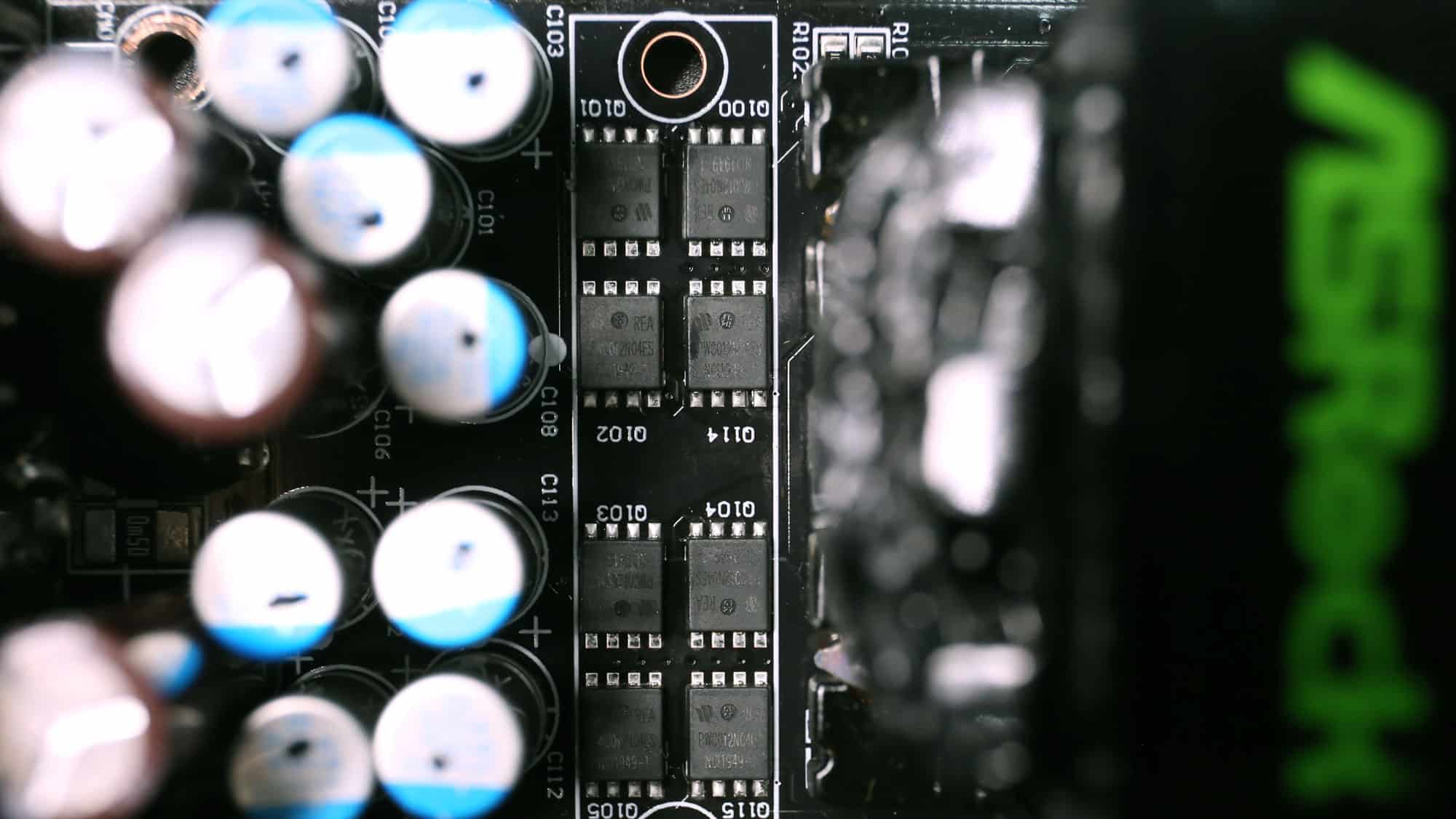Eight Perfect Way PWC012N04ES FETs regulate the 12V rail. They are installed on the business side of the main PCB, and a heatsink right above them is used to cool them down.