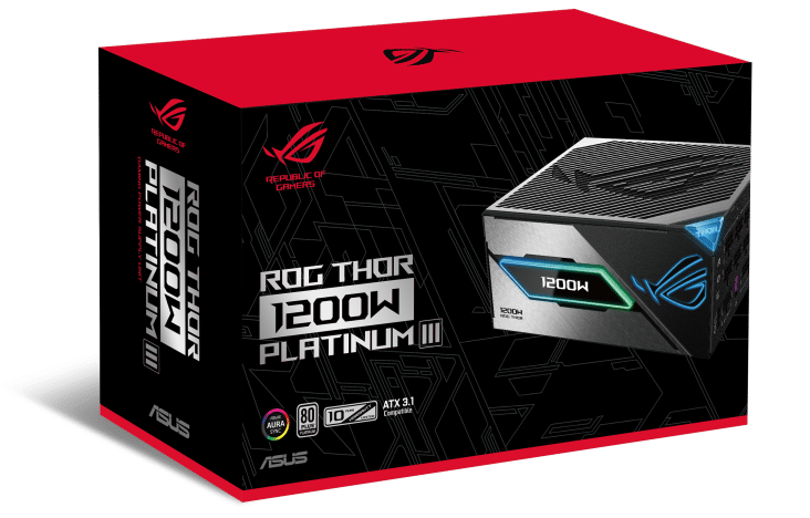 My sample didn’t arrive in the retail box, so I used a stock photo here. Like all ROG products, the box features nice graphics, showing an angled picture of the PSU with its OLED screen depicting full power.