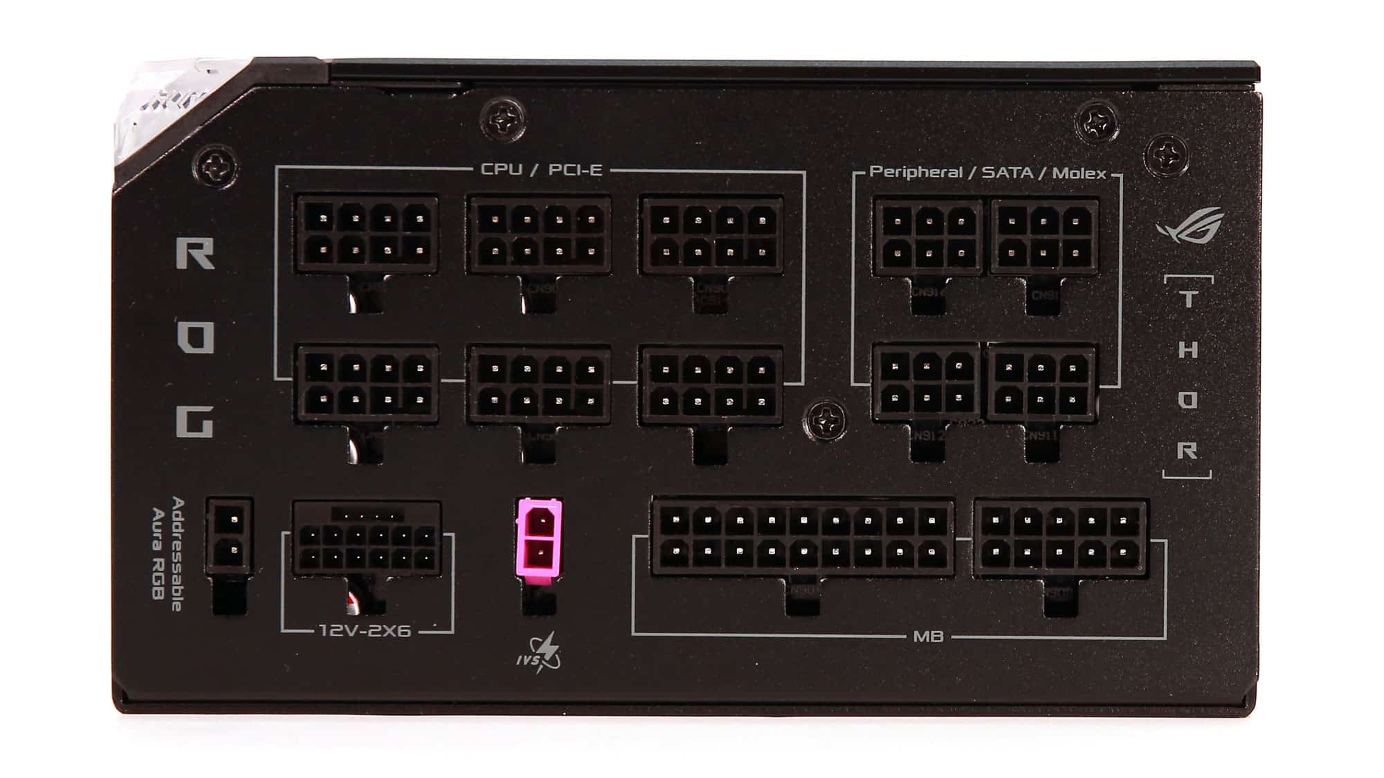 The modular panel includes 15 sockets. Besides the native 12V-2×6 header, there is also a smaller 2-pin one for voltage sense. Asus states this circuit provides a tighter 12V rail under high transient loads. This remains to be seen in the respective test sessions. There is also another 2-pin header for the addressable Aura RGB signal.