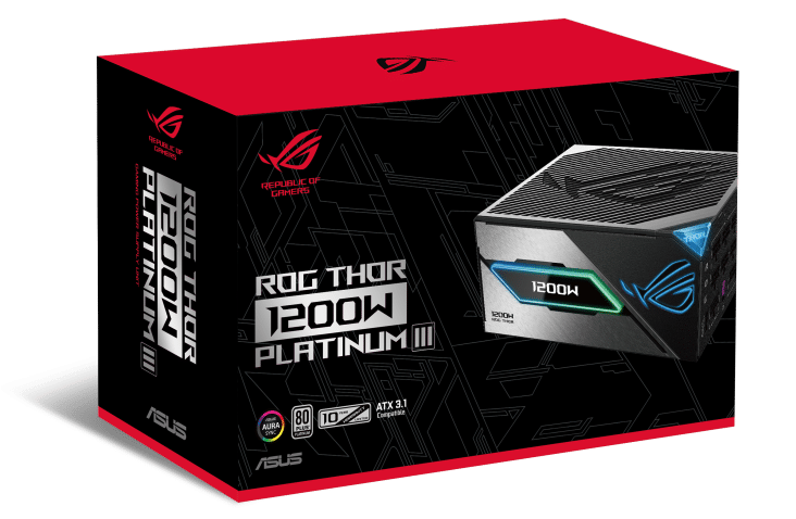 My sample didn’t arrive in the retail box, so I used a stock photo here. Like all ROG products, the box features nice graphics, showing an angled picture of the PSU with its OLED screen depicting full power.