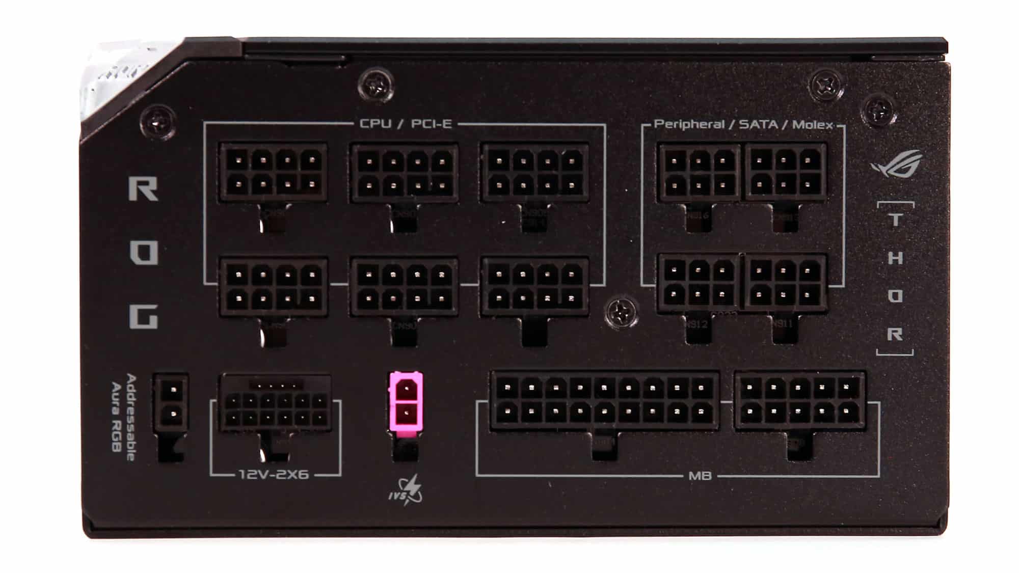 The modular panel includes 15 sockets. Besides the native 12V-2×6 header, there is also a smaller 2-pin one for voltage sense. According to Asus, this circuit provides a tighter 12V rail under high transient loads. This remains to be seen in the respective test sessions. There is also another 2-pin header for the addressable Aura RGB signal.