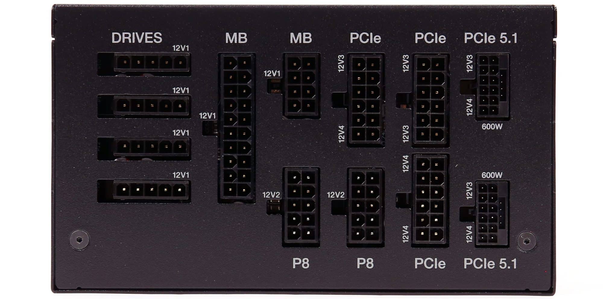 The cables are long. The ATX and high-power cables use thicker 16AWG gauges for lower voltage drop at high loads. The pair of 12V-2×6 is a pleasant surprise, though it is overkill to have both set to 600W, since it alone exceeds the PSU’s max capacity.