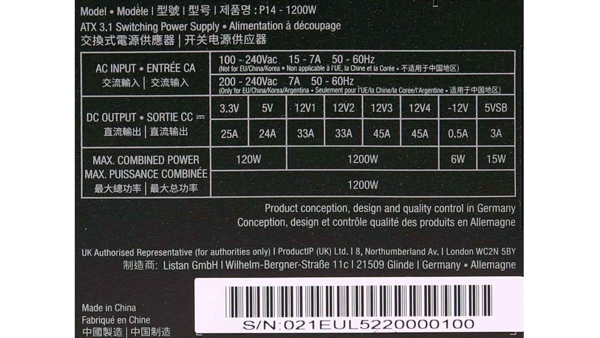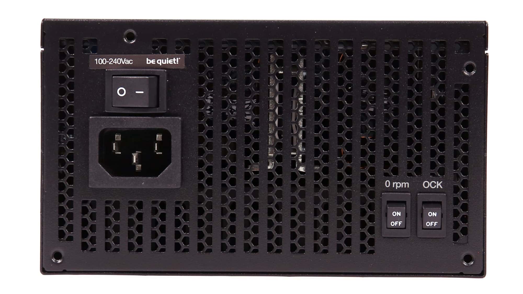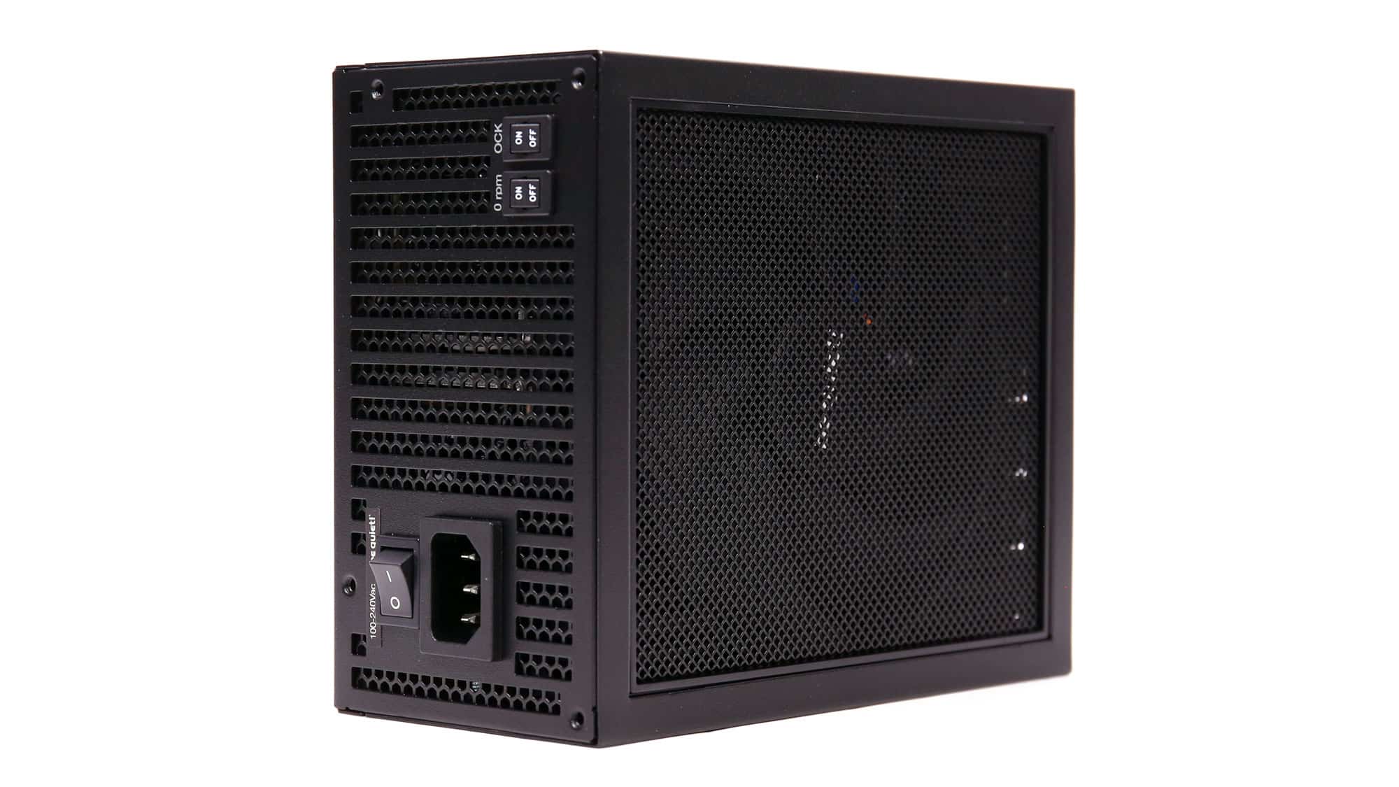 At the unit’s face, we find two additional switches. One enables the zero-RPM mode, and the other (OCK Button) lets you combine all 12V rails into a single rail, which I recommend. On the sides, the Dark Power logo looks great, while on the back, the modular panel takes up almost all available space, making it easier to handle the modular cables.