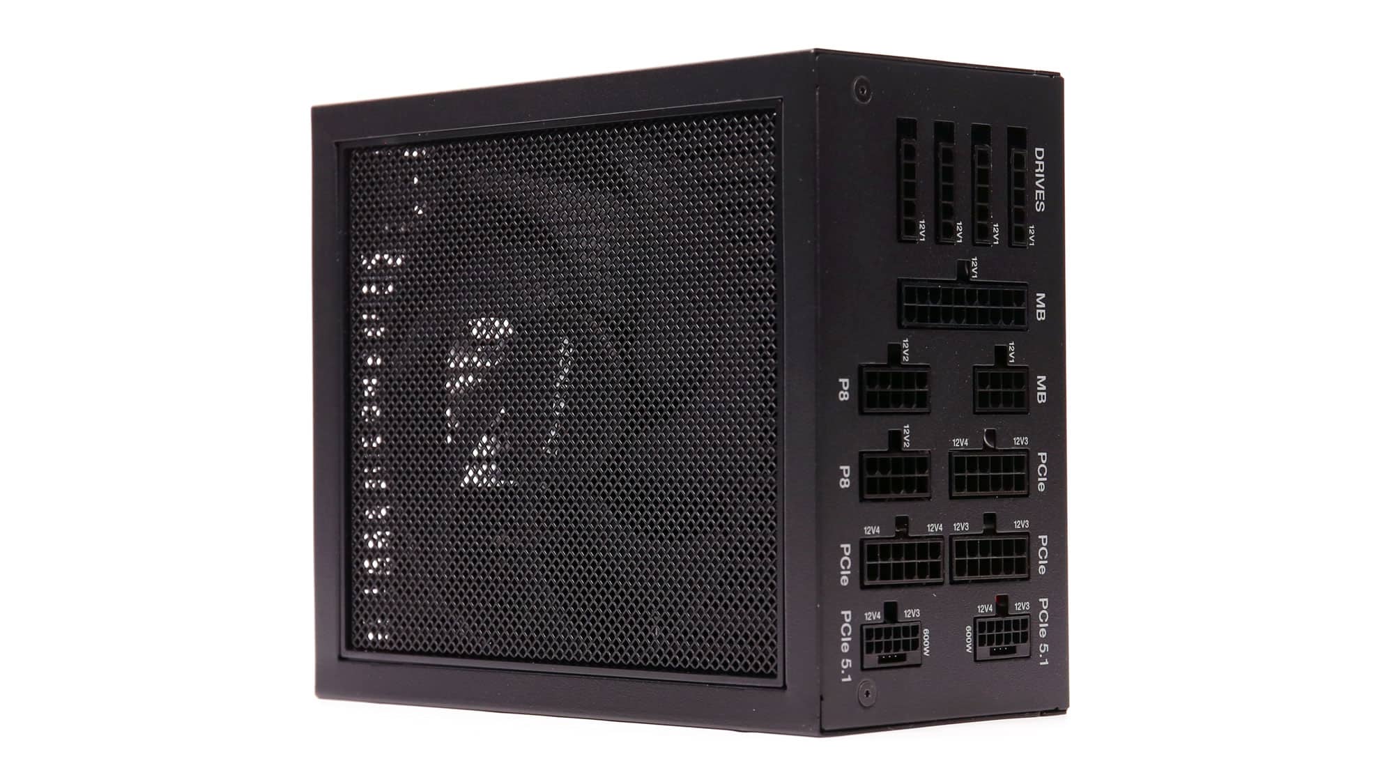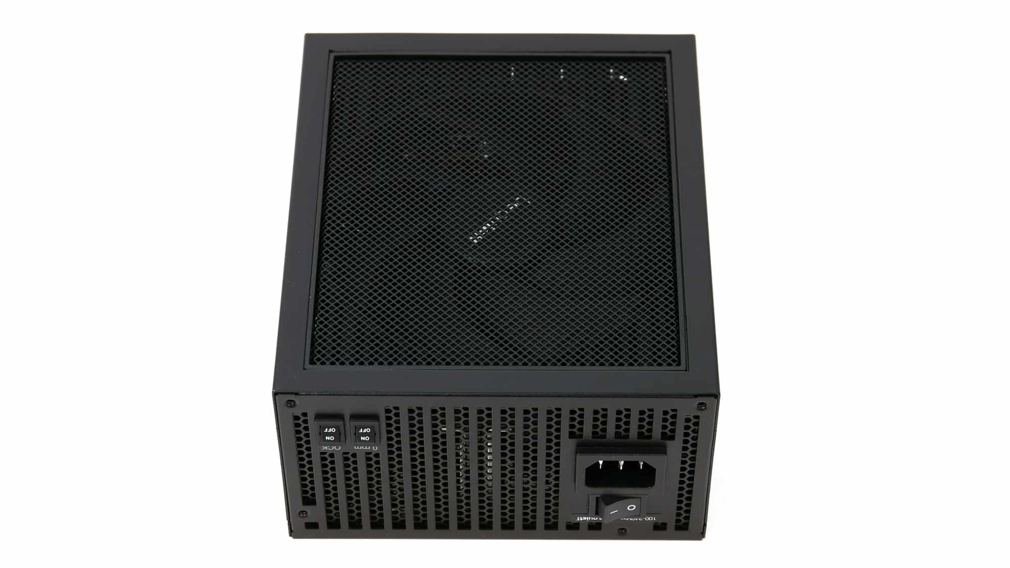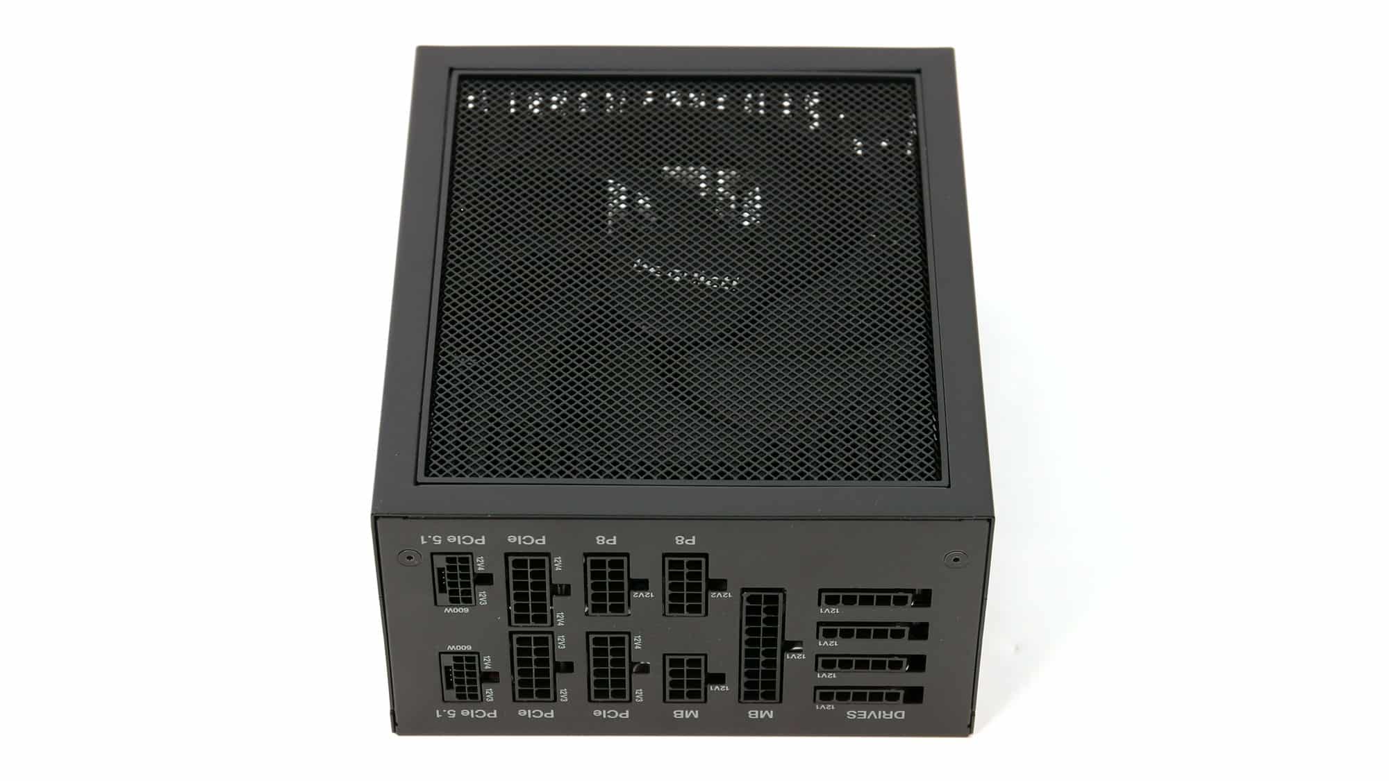 The PSU’s exterior design and overall build quality indicate that this is a premium product. The fan grille has many perforations, but they are pretty small, which impacts airflow. The fan speed profile is relaxed, though, because of the highly efficient platform and the massive heatsink that surrounds the cooling fan.