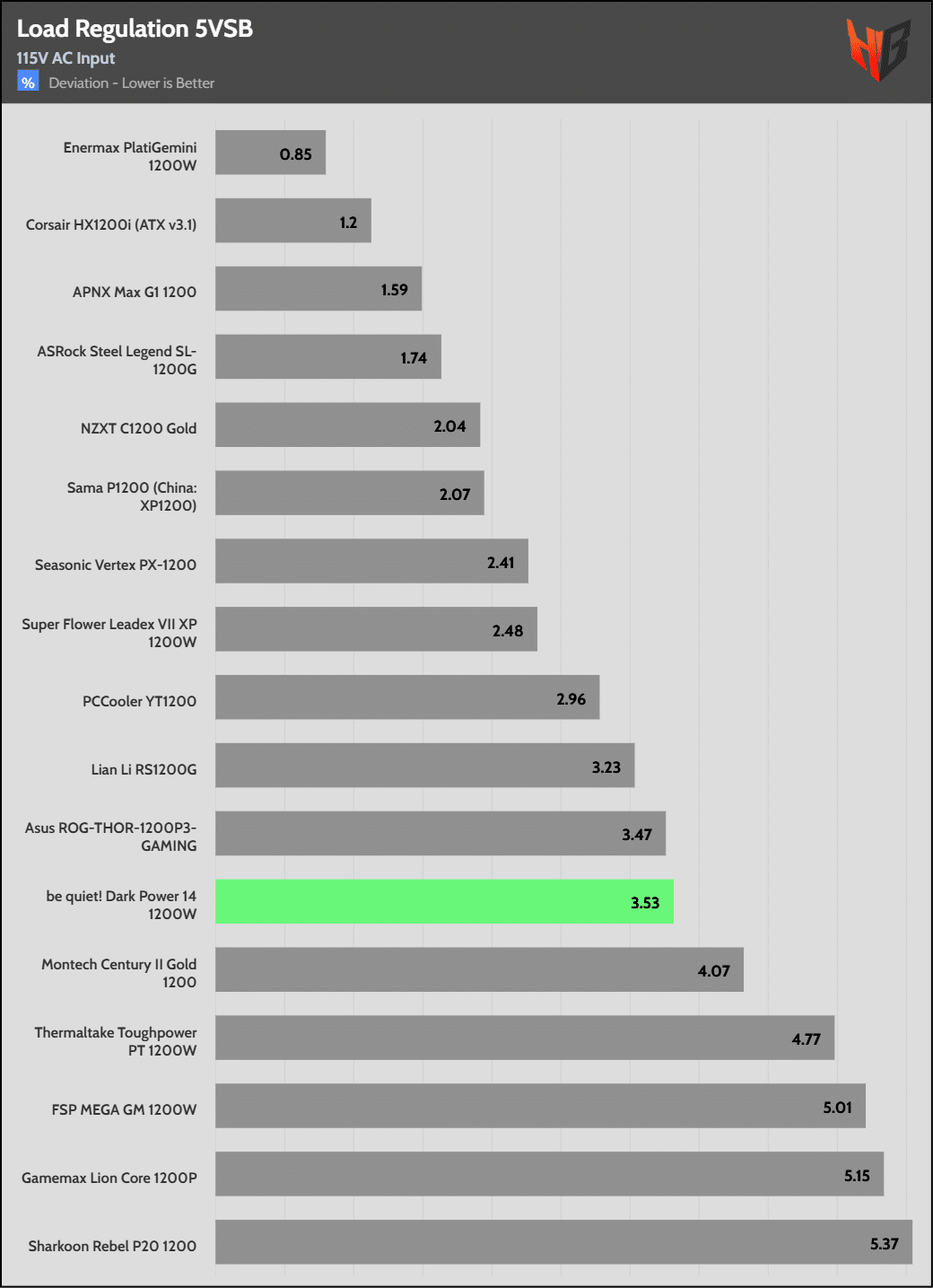 | Test | 12V | 5V | 3.3V | 5VSB | DC/AC (Watts) | Efficiency | Fan Speed (RPM) | PSU Noise (dB[A]) | Temps (In/Out) | PF/AC Volts |