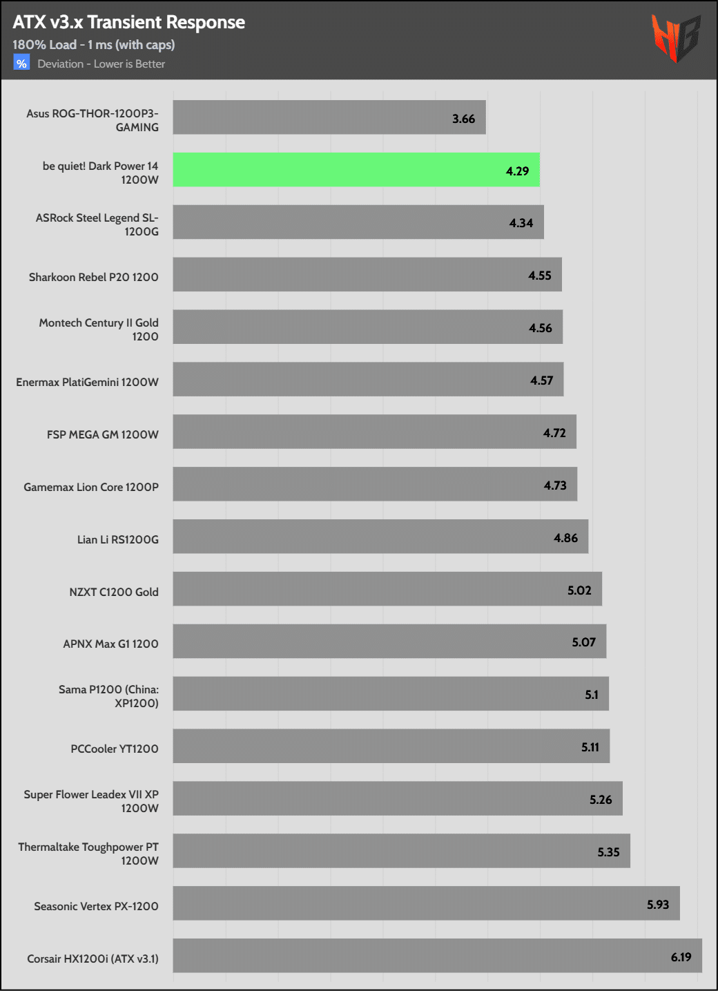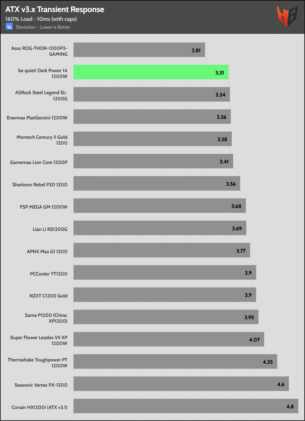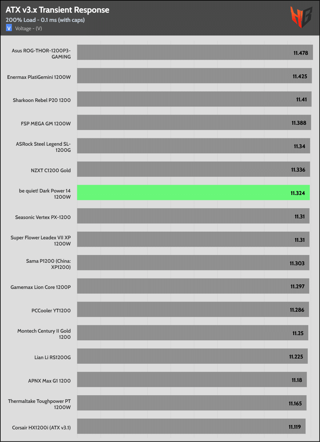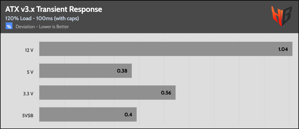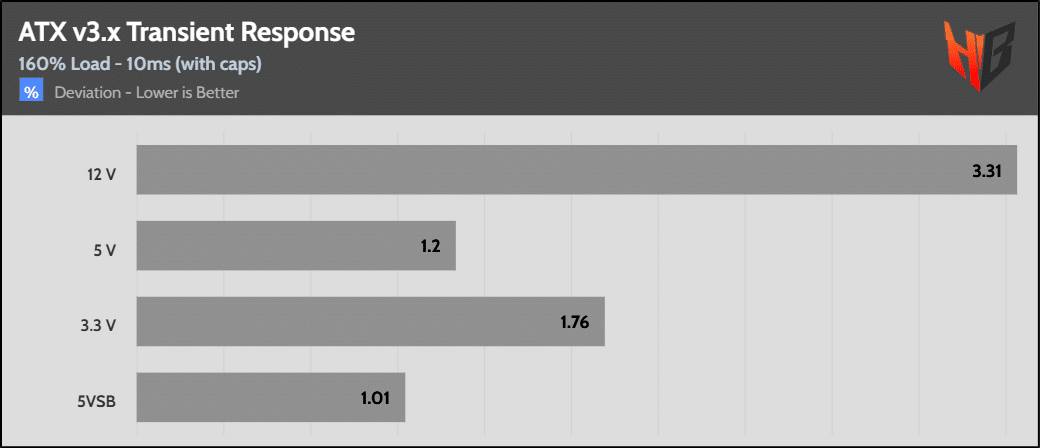 [Note] For PSUs without a 12+4 pin connector, the maximum applied load for the transient response tests is 150%, rather than 200%.The PSU passes all ATX v3.1 transient response tests, but the 3.3V rails drop low.